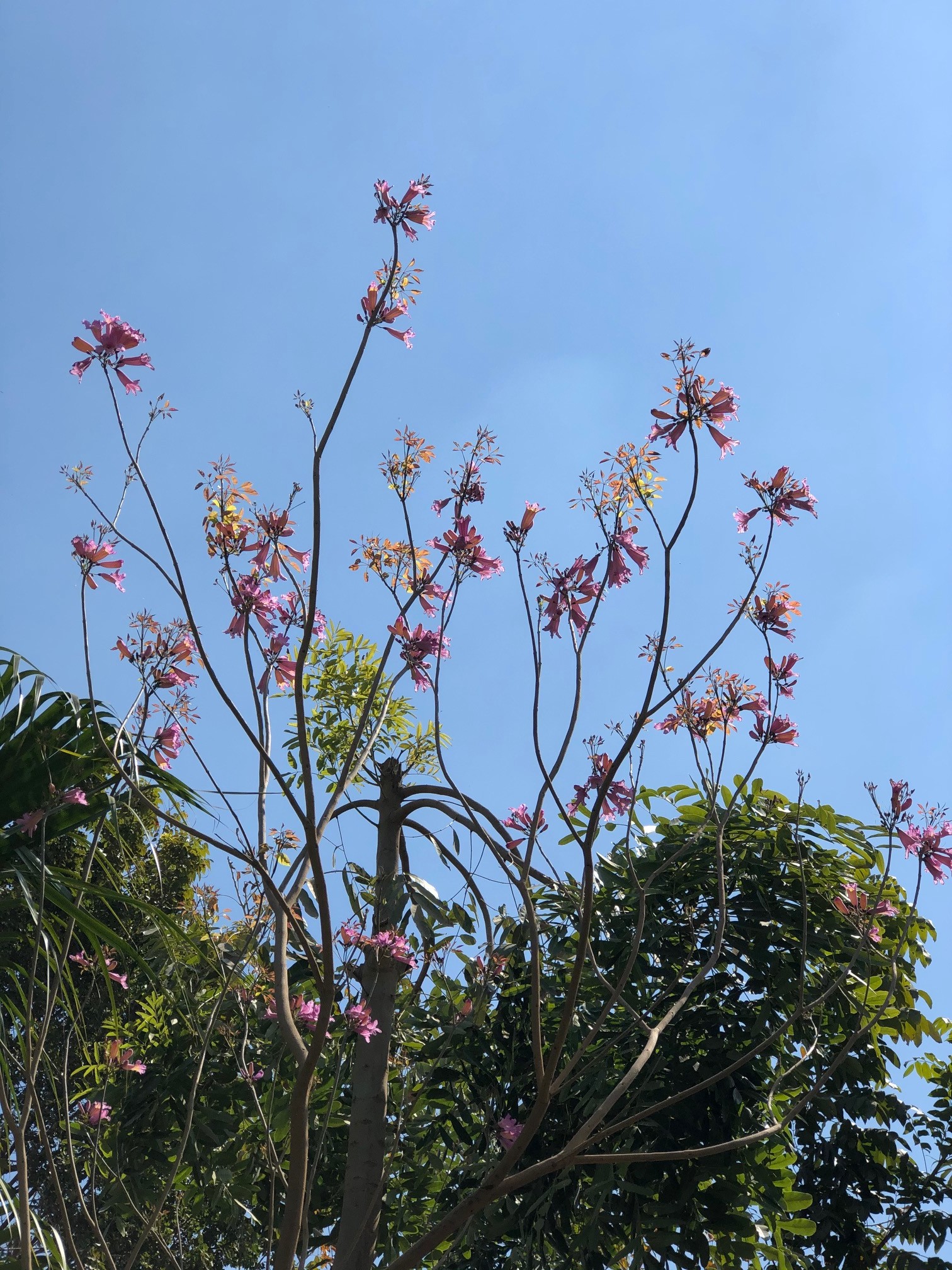 Deciduous tree growing up to 6-12 m high bark grayish fissured, dark brown to black leaves palmately compound 3-7 leaflets, dark green and glossy , paler underneath flowers tubular, funnel-shaped, pink with yellow orange inside, blooming blooming profusely on bare branches fruit woody pods, narrow, long, containing winged seeds