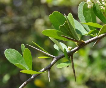 Evergreen shrubs grow to 4-9 m tall bark light brown, smooth and light brown when young,  becoming flakey, rough, corky and fissured, spines long, straight leaves clustered on short shoots, narrowly obovate to oblanceolate, hairless, with  margins toothed in the upper half flowers small whitish, unpleasantly scented fruit capsule 3 lobed