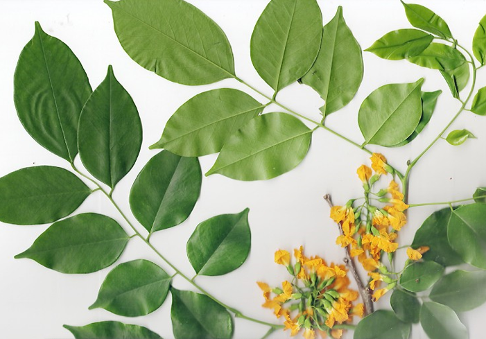 Semi deciduous tree up to 40 m tall, bark grey-brown leaves alternate,  odd-pinnate leaflets 5-11, broadly ovate to elliptic shaped flower yellow I cluster  panicle or raceme fruit pod is disc-like 3-5 cm diameter, with a central seed- bearing  portion and a flattened wing surrounding the central part