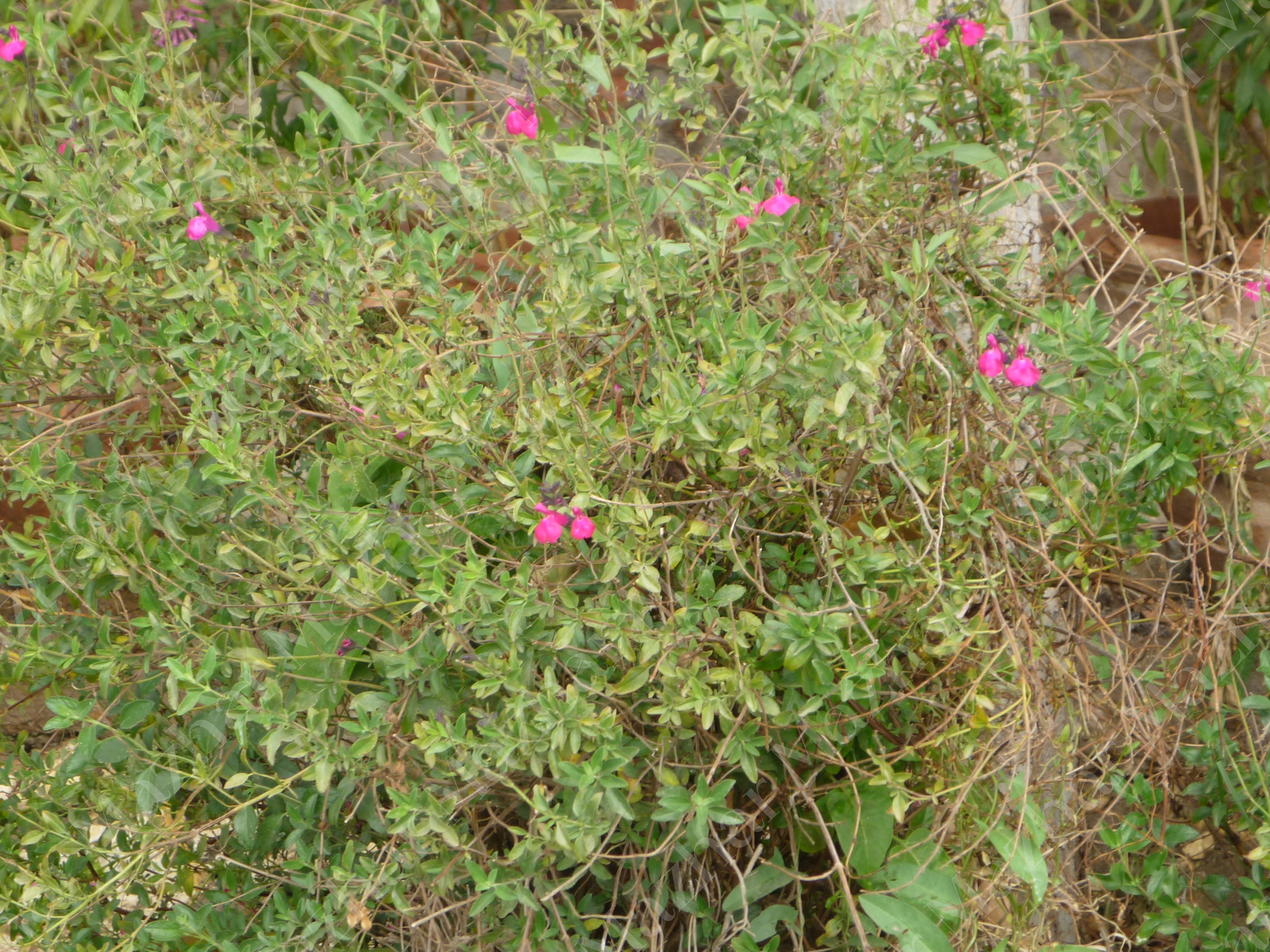 An evergreen subshrub up to 1 m tall, with bright pink/rose bilabiated flowers and small ovate leaves with strong mint-like fragrance