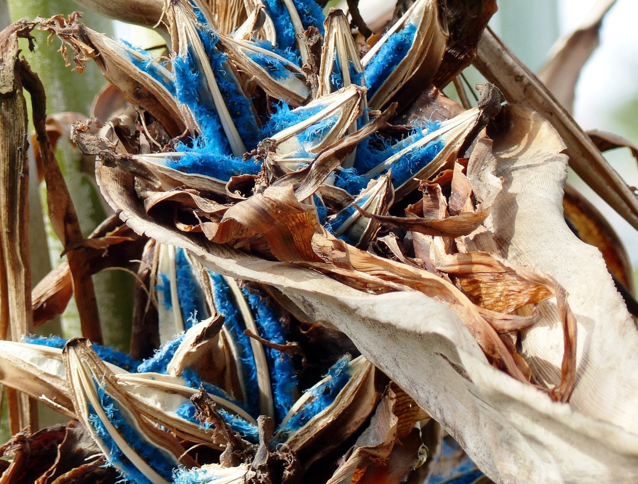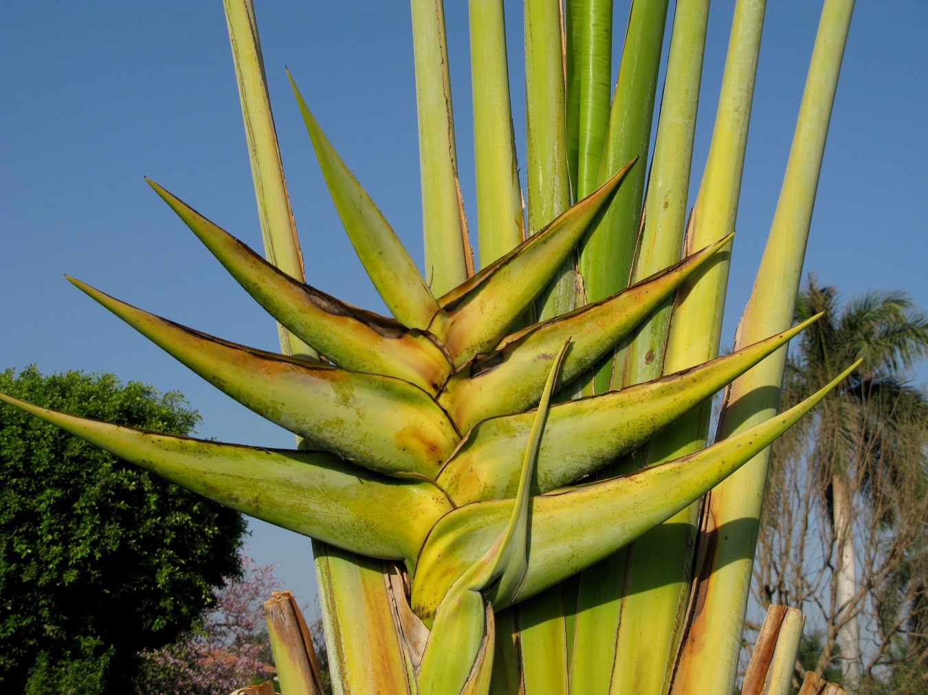 Evergreen tree with an open, fan-like crown, usually  20 m tall leaves banana-like 25-4 m long The large white flowers are structurally similar to those of its relatives, the bird-of-paradise flowers Strelitzia nicolai, but are generally considered less attractive, with a green bract[6] These flowers, upon being pollinated, produce brilliant blue seeds In tropical and subtropical regions, the plant is widely cultivated for its distinctive habit and foliage As the plant grows older, it progressively loses the lowest or oldest leaves and reveals a sturdy grey trunk