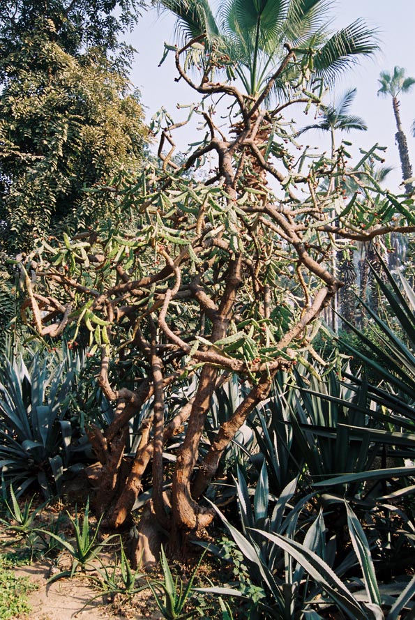 Evergreen shrub or small tree growing 5 m tall the old trunks stoutly cylindrical, very spiny, stem joints narrowly elliptic-oblong, the areoles with 2-8 stout spines flowers dark red to pink