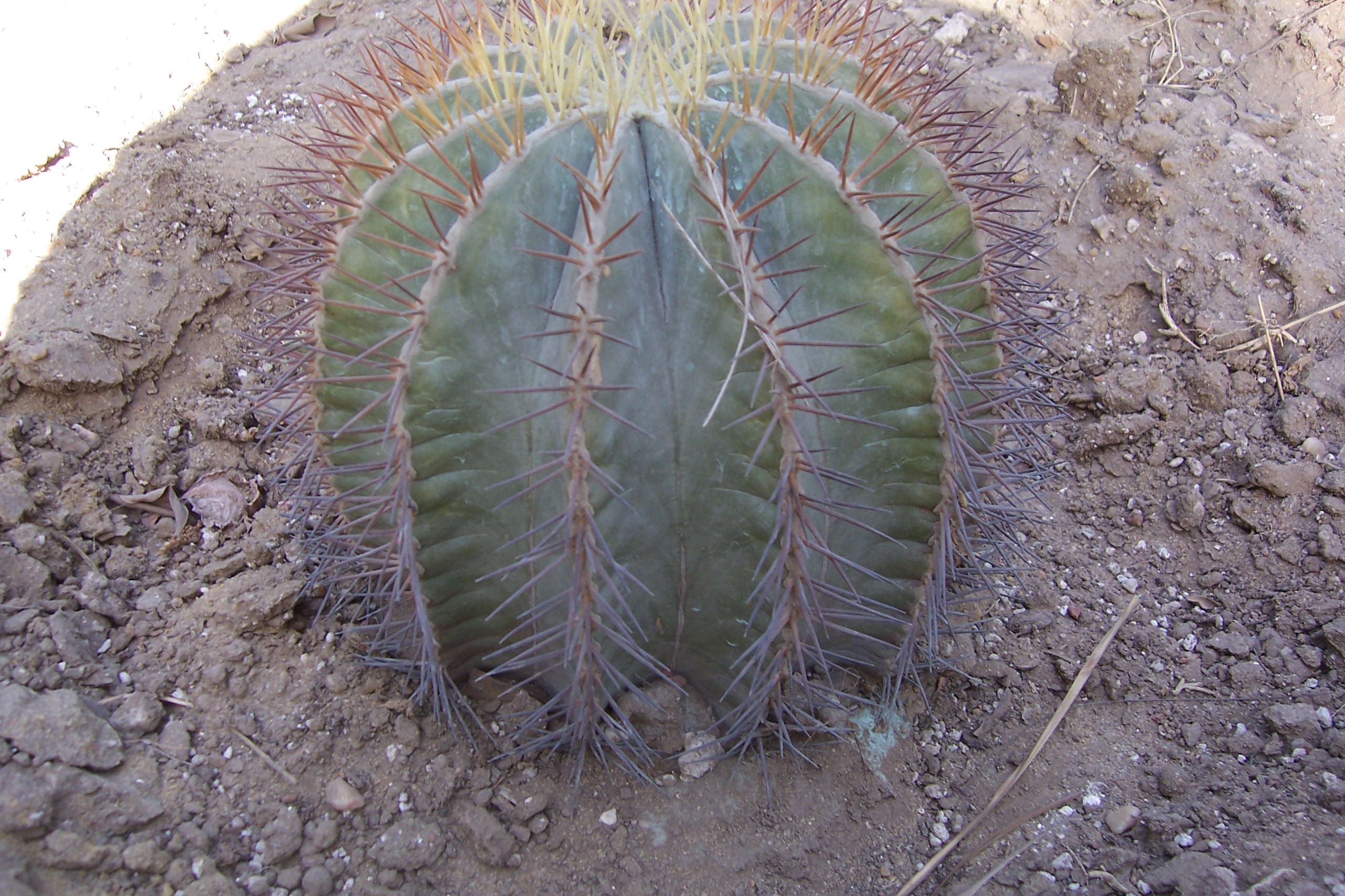 Spherical or cylindrical blue- green, growing 45 cm high, 60 cm in diameter ribs 11-15 radial spines 6-7 straight , light yellow, central spines 0-1, very similar to the radials flowers yellow, funnel shaped fruit white 2 cm long