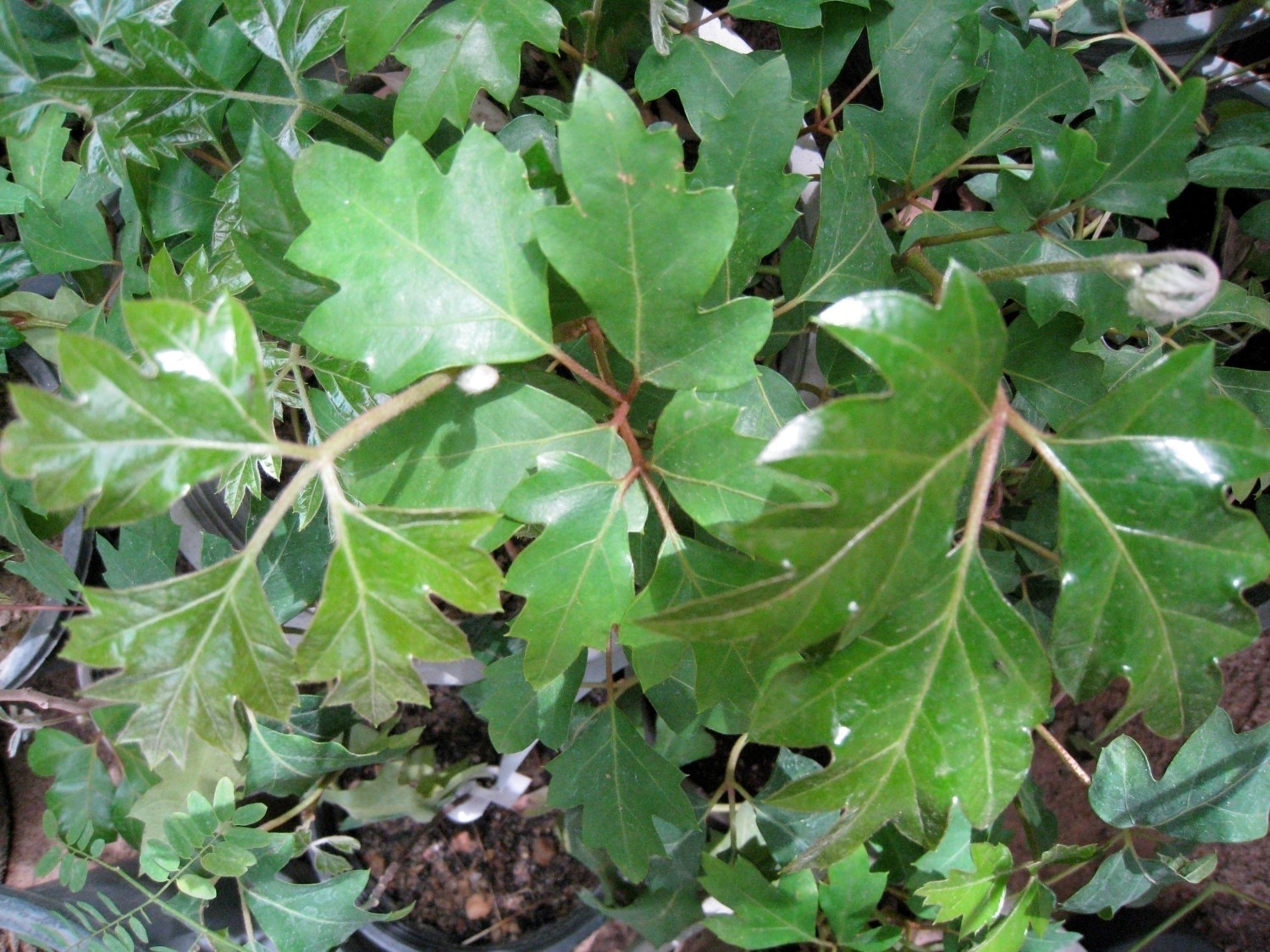 Creeper or climber  by tendril, to 09-3 m high, leaves compound, 3 leaflets, dark green with brownish undersides, irregularly toothed margins