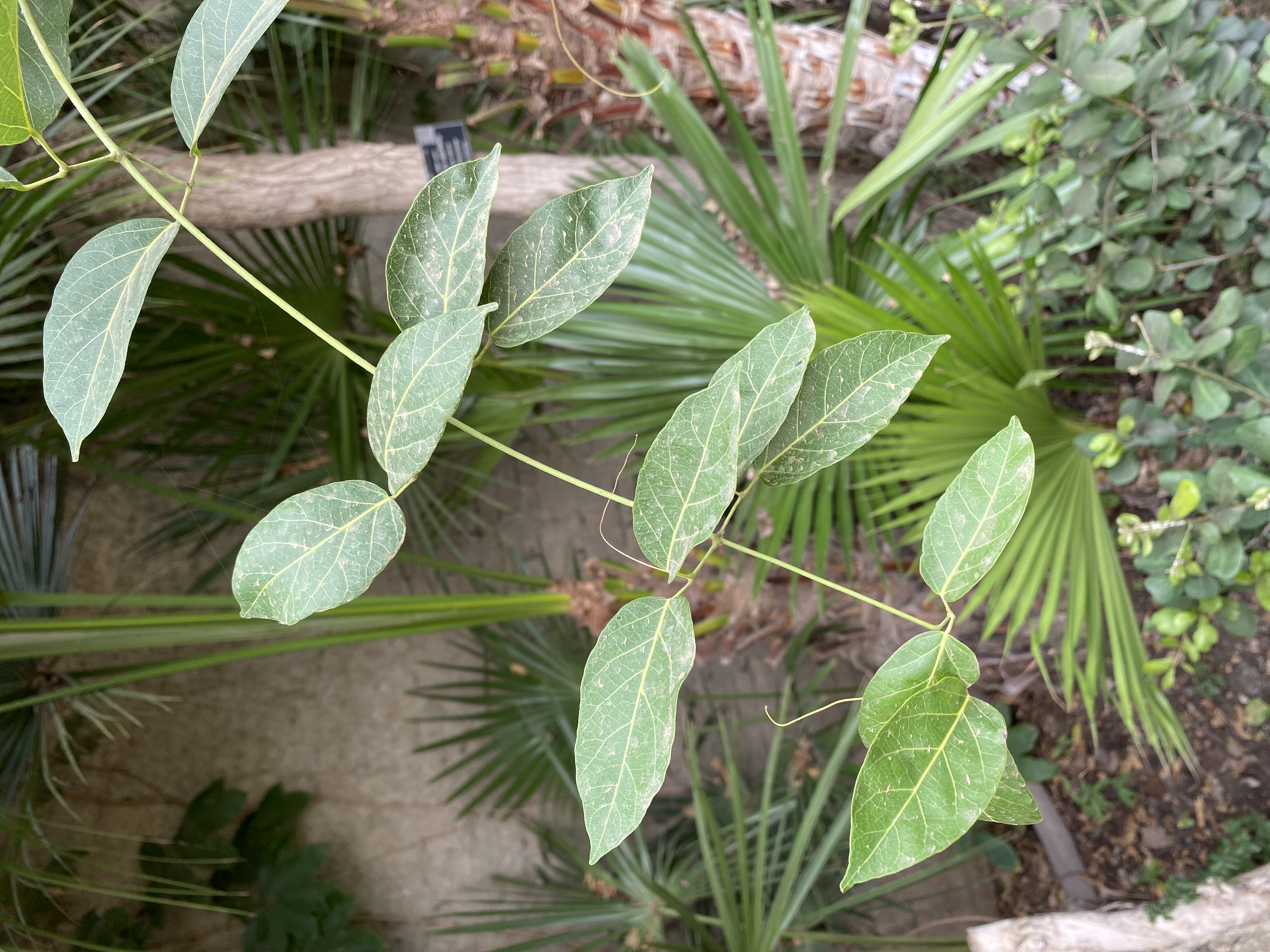 Evergreen climbing  grow up to 4-5 m tall leaves opposite in pairs and tendrils arise at the ends of the leaf stalks, leaflets 76 cm long and 38 cm wide flower pale lavender, seeds pods large prickly