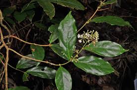 Evergreen climbing shrub grow up to 10 m tall leaves elliptic or ovate,  pointed tips flowers fragrant, white to pinkish, borne in terminal or axillary cymes