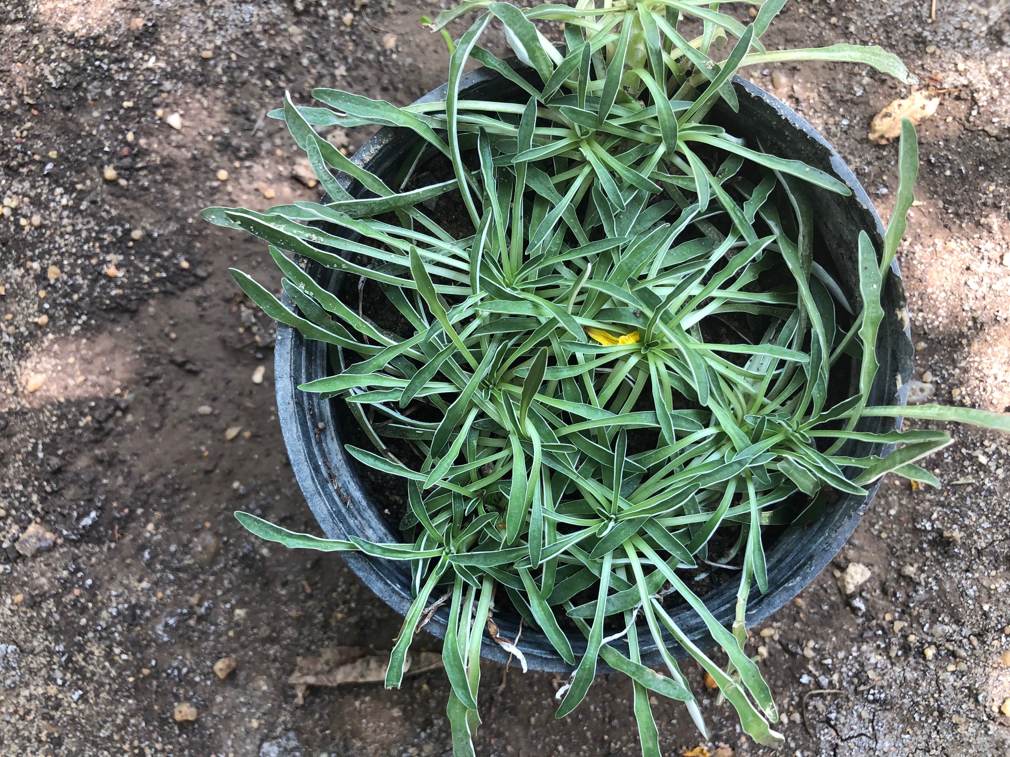 Evergreen perennial 50 mm high and with creeping leaves linear-oblanceolate, blue-grey, basal leaf borne on short erect shoots from the rhizome, Leaf margins are slightly incurved showing the pale, felt-like undersides The upper leaf surface is dark green and glabrous flowers small, solitary, yellow, 25 mm in diameter