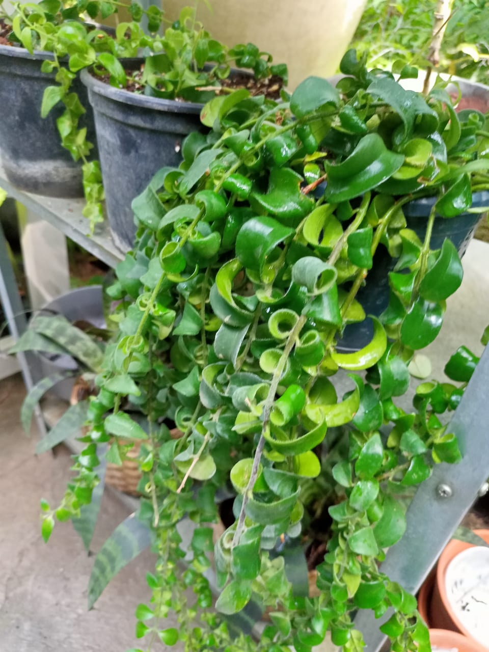 Hoya Carnosa Krinkle Kurl, also know as The Hindu Rope Plant, Hoya Compacta, is a very interesting hanging or vining plant, its leaves curl forming a rope like effect, is a very distinct feature only seen in the Hoya rope variety, The rope plant is really a mutation of the Wax Plant, known for its thick waxy leaves, this variety is not variegated, its waxy leaves are dark green on the outside and light mate green on the inside of the leaves