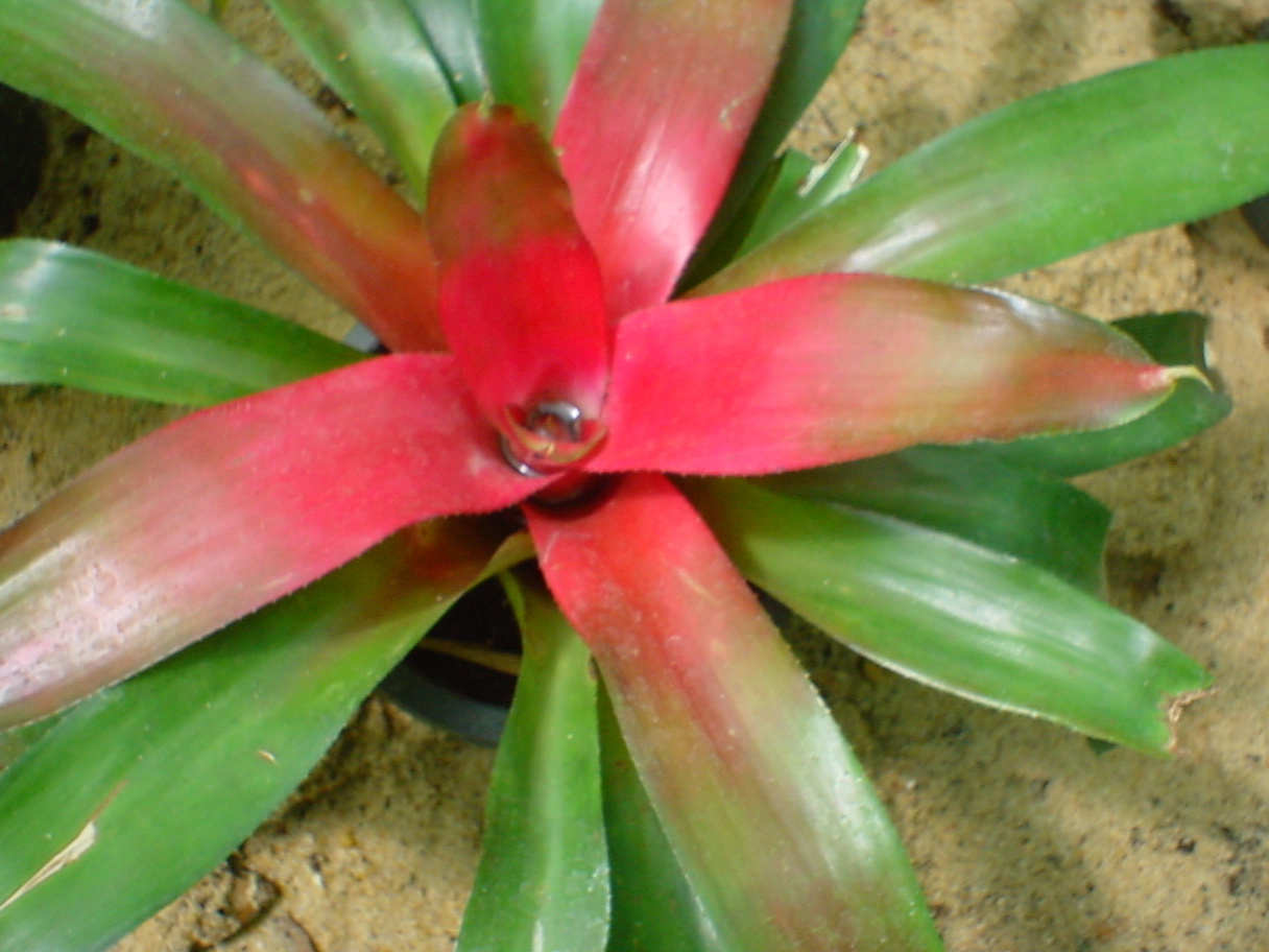 Epiphytic evergreen perennial, about 20 cm tall, leaves green, narrow, leathery, shiny, spine-tipped, lance-shaped, with  a funnel- shaped rosette The leaves surrounding the central cavity before the blossoming, become of a lively red colour, which persist for about one year, whilst the inflorescence is formed by an extremely short raceme with small flowers of a lavender colour placed at the same level and almost hidden at the bottom of the cavity
