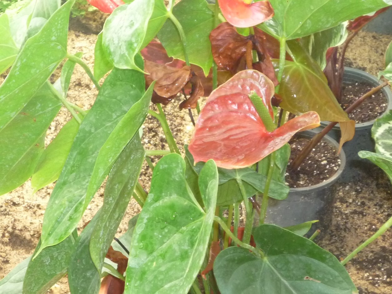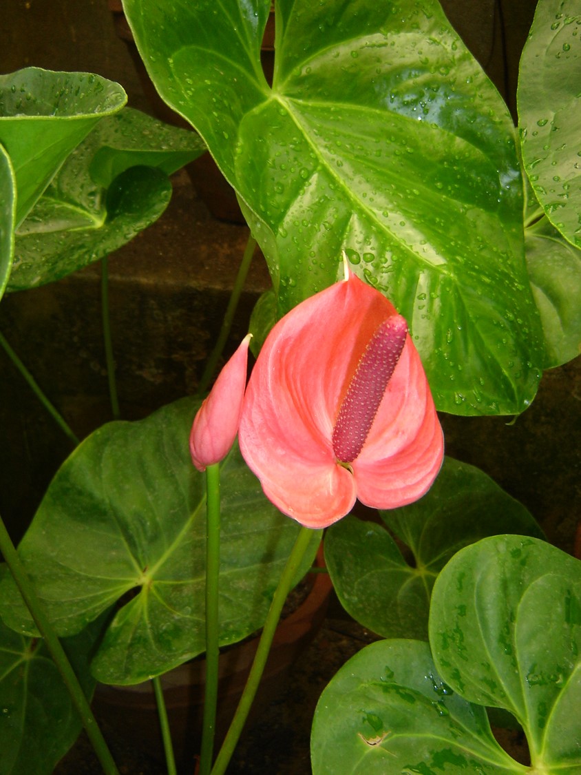 Evergreen perennial, preferring warm, shady and humid climates leaves hear-shaped, cordate bas, apex acuminate spathe is cartilage-waxy, brightly coloured red, pink, white 8-15 cm long