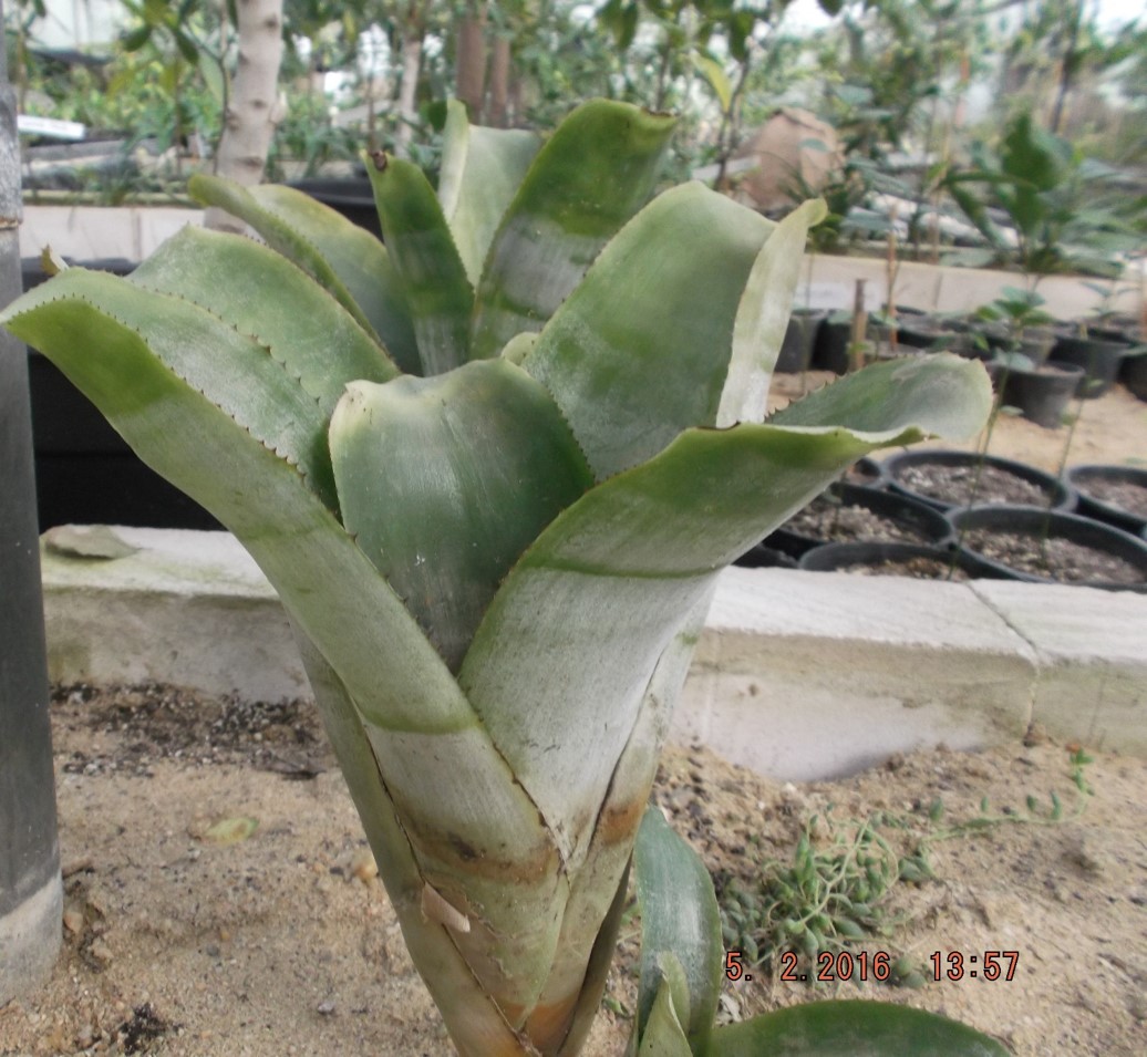 stemless plant, 30-60 cm tall, leaves resemble an urn, basal rosette ,stiff, arching, broad ,  strap-shaped, elliptic-oval, silvery-green, margins have black spines