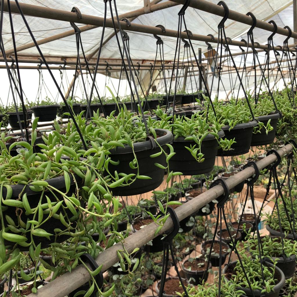 Trailing succulent, grows 61 cm tall leaves shaped like bananas or fish hooks, which taper and curve to a pointed tip, flowers white have a cinnamon-like scent