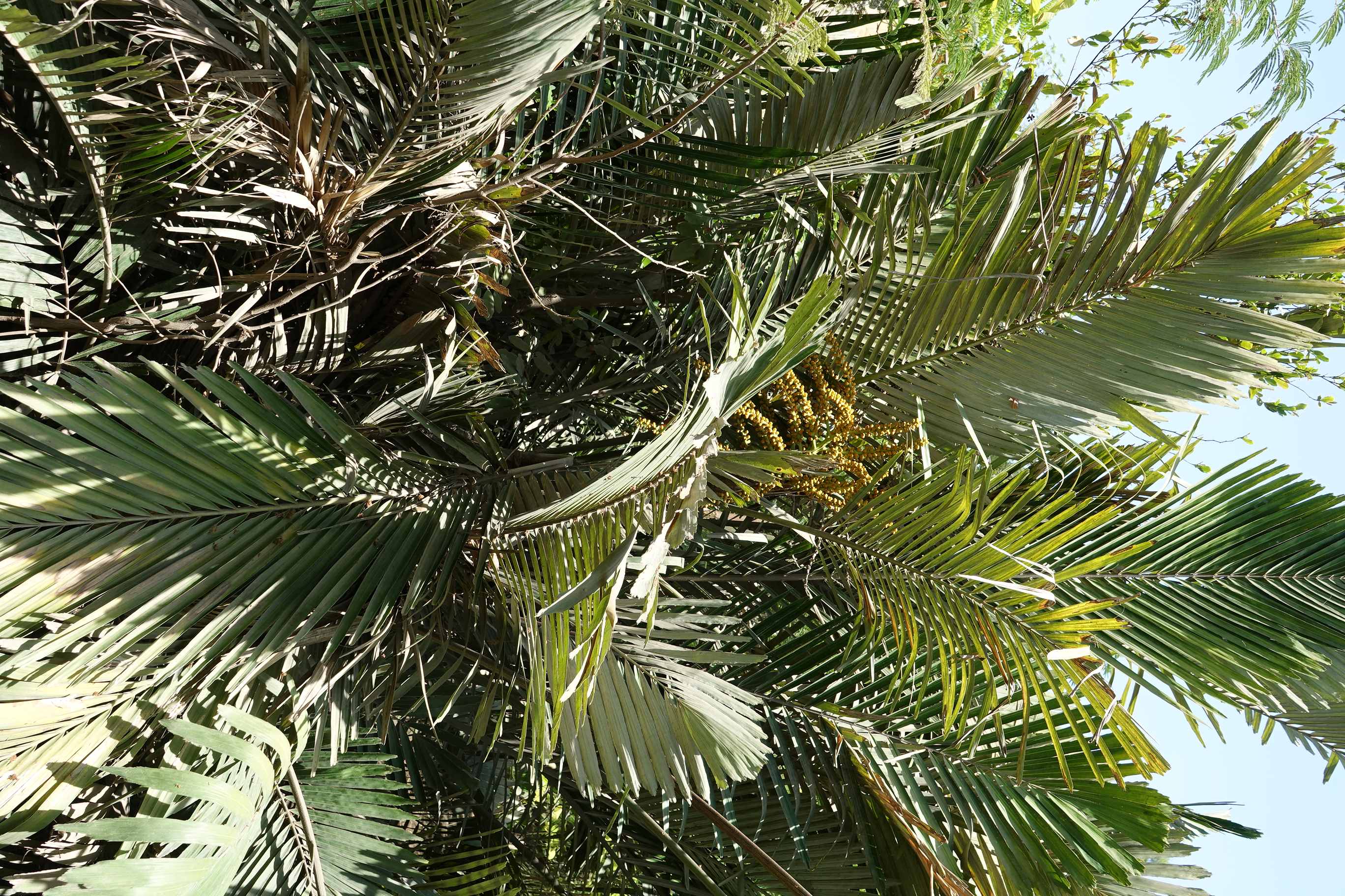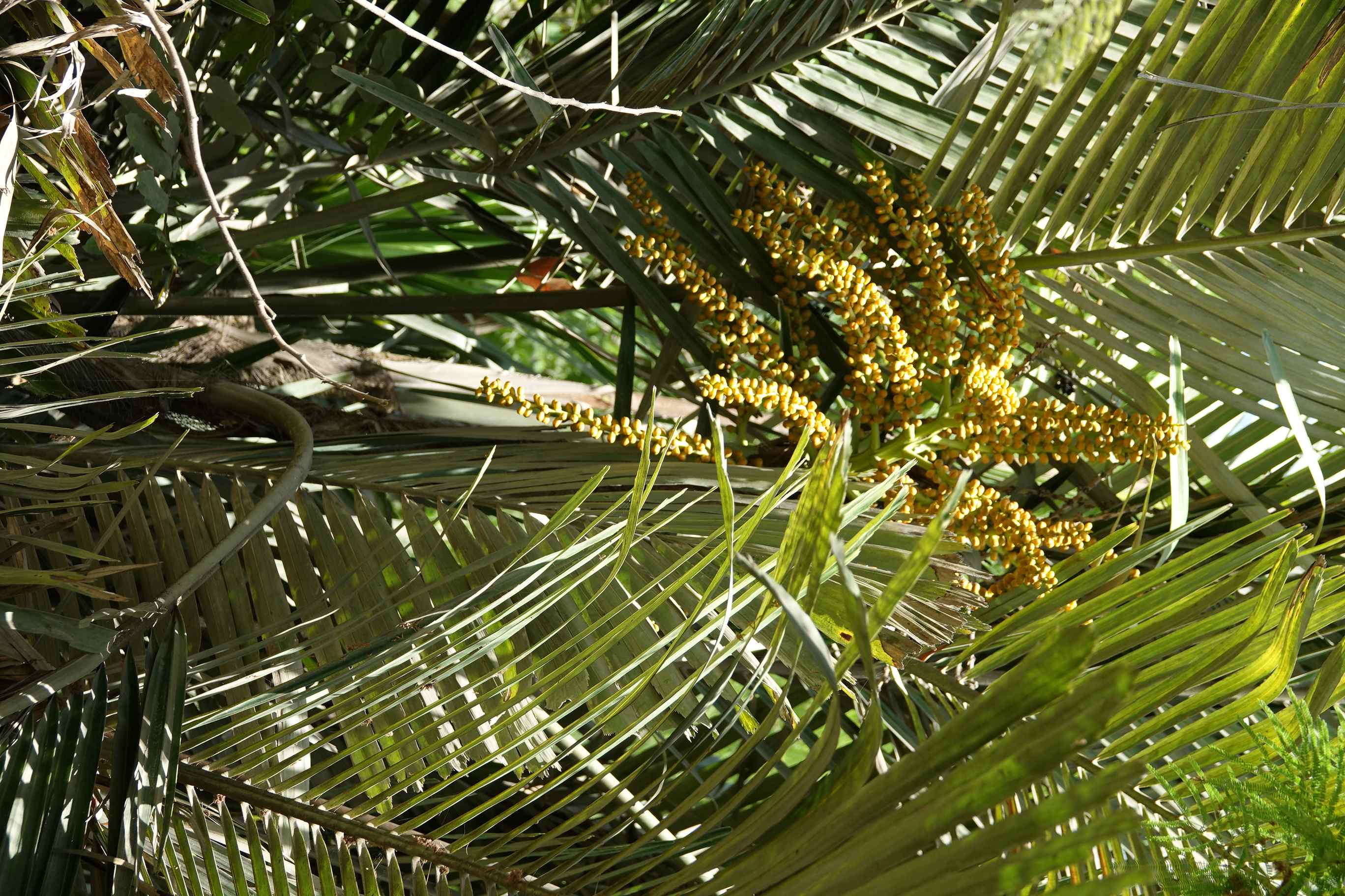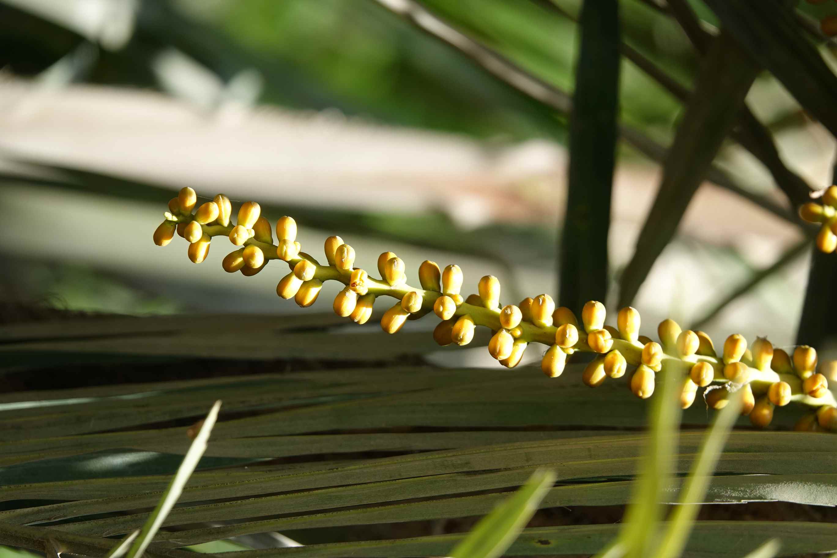 Multi-stemmed, evergreen palm, forming a clump up to 3m tall, and 5 m wide leaves pinnate to 3 m long, with leaflets that are green above, silvery-white beneath inflorescences  about 05 m long, flowers yellow to orange, fragrant fruit spherical 1 cm long when mature After the fruits ripen, the stem on which they grew dies while other stems in the cluster continue to grow
