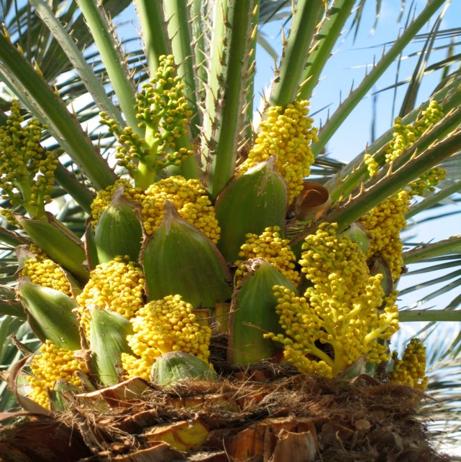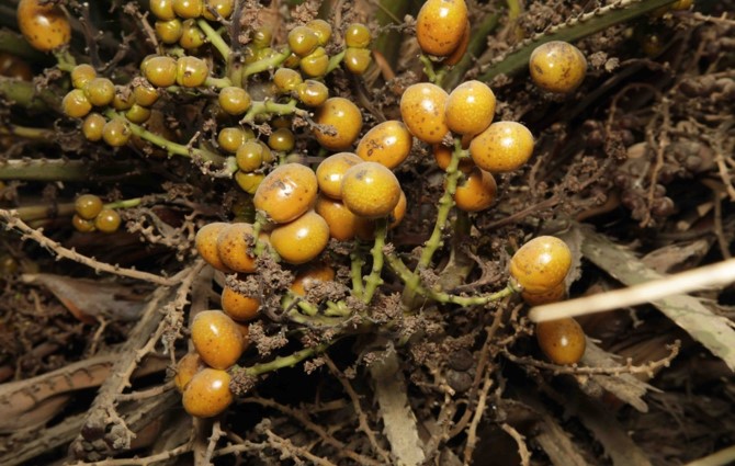 Clumping palm, with several stems growing from a single base, stem grow 2-5 m tall with a trunk diameter of 20-25 cm leaves: with petioles terminating in rounded fans of 10-20 leaflets, each leaf is up to 15 m long, with leaflets 50-80 cm long Inflorescences: short at the tops of the stems, yellow flowers male and female are borne on different plants fruit: spherical to oblong, 1-15cm in diameter, yellow, orange, or brown when ripe