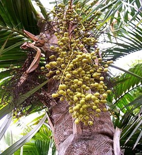 Solitary trunk grow 2-6 m tall leaves: fan, dark blue-green above and silver-coloured below flowers  are white and small on light orange branches fruit: globose and half an 25 cm in diameter