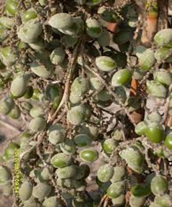 Single-stemmed, growing from 8-25 m tall, 17-22 cm in diameter leaves fan, wax, 40-70 cm  the inflorescence is almost 2 m long, flowers yellowish green fruit globular, a dark pulpous berry that contains a light-brown , 12 mm long ovoid seed