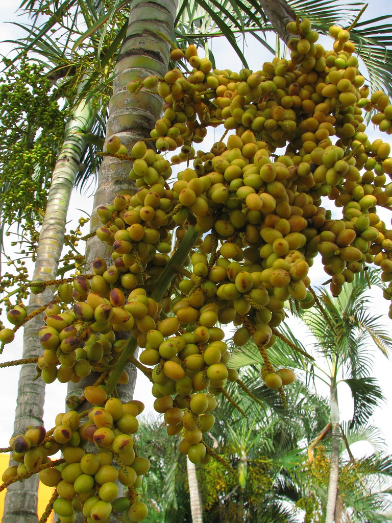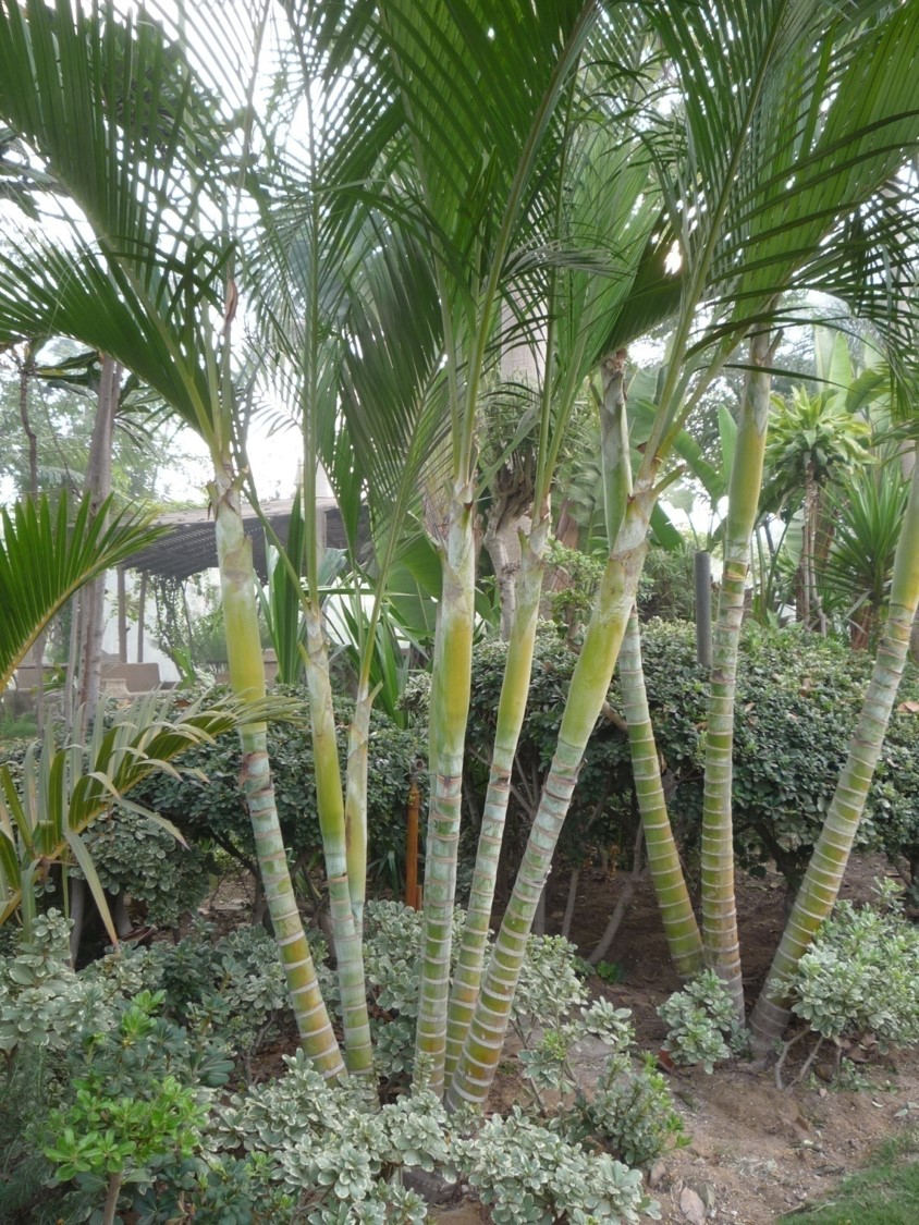 Multiple stems emerge from the base, grows 6-12 m tall leaves pinnate 2-3 m long, arching inflorescences yellow, occurring at the base of the crownshaft fruit oblong, about 17 cm long, asymmetric, ripening from yellow to purple
