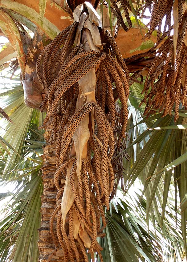 Solitary palm, dioecious palm, up to 12 m tall, mature trunk gray, smooth and slightly swollen at the base leaves fan-shaped (costapalmate) about 1-15 m long,  with red petiole the first years inflorescence coming from the leaves, small and yellow in color fruits oval shaped, brownish green and fleshy