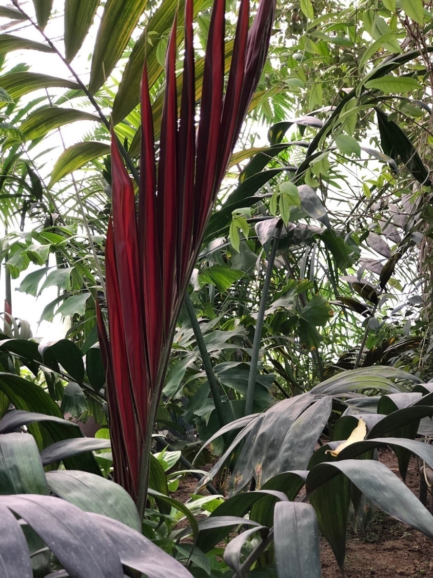 A feather solitary to about  6-10m tall, leaves 36 m long, young leaves are reddish  purples, and  slowly turn green when mature The deep emerald green crownshaft is 90 – 120cm high, and emerald green coloured,  flowers greenish white, fruits round or egg shaped about 5 cm diameter, deep red coloured when mature