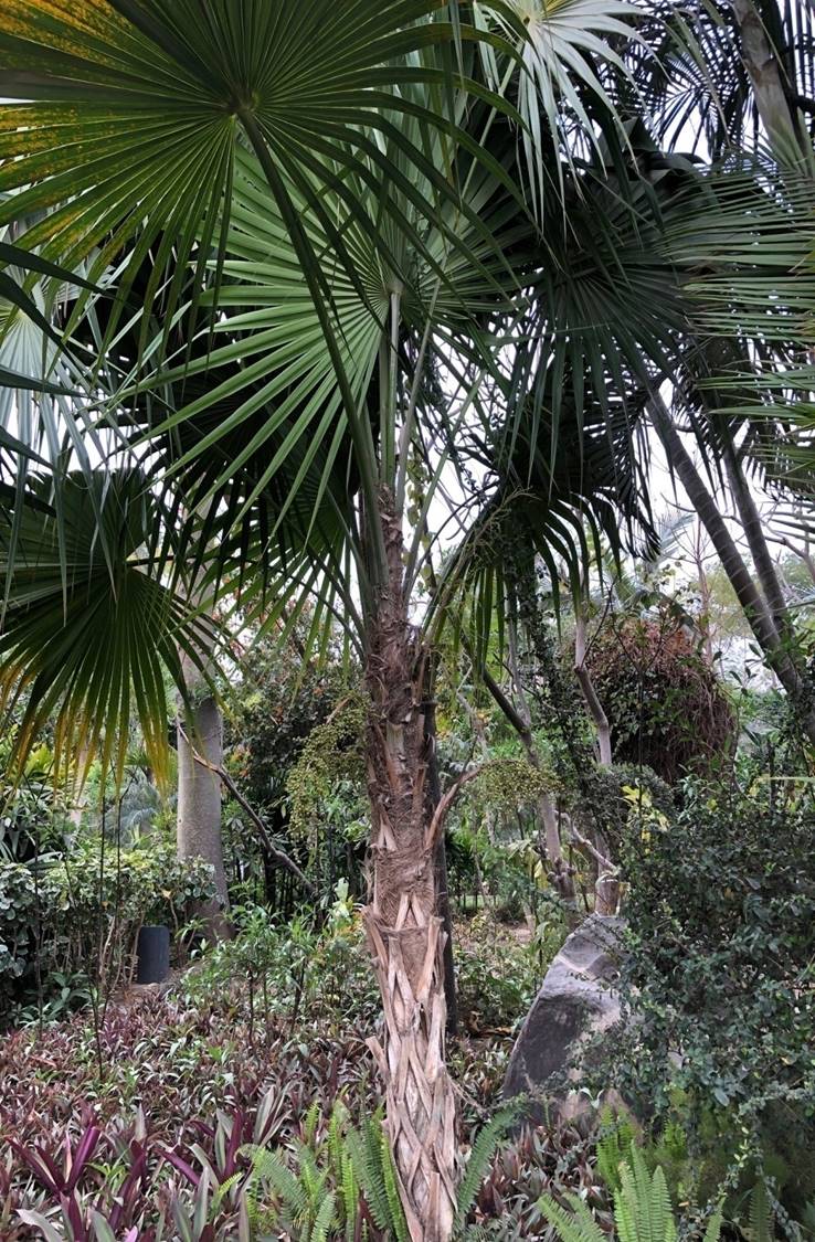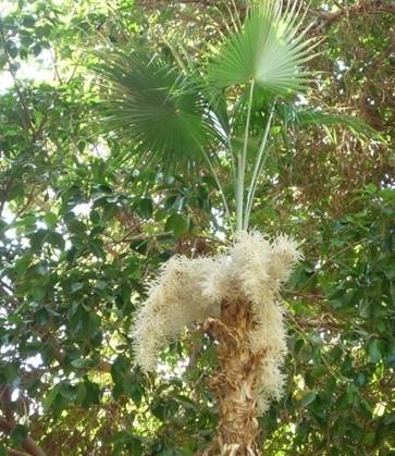 Solitary stemmed,  grows up to 11 m high, 35 cm in diameter leaves  fan-shaped, pale blue green, whitish on the undersides the inflorescences  extend the leaves and 55-100cm long fruit white, turn yellow as they mature