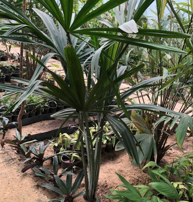 ornamental palm. The sugary sap, obtained by tapping the palm top and inflorescences, is made into wine, sugar, alcohol, or vinegar. The adult leaves are used for roof thatching, manufacturing of mats and umbrellas, especially the midribs of the leaves for furniture making and constructions of interior house walls.