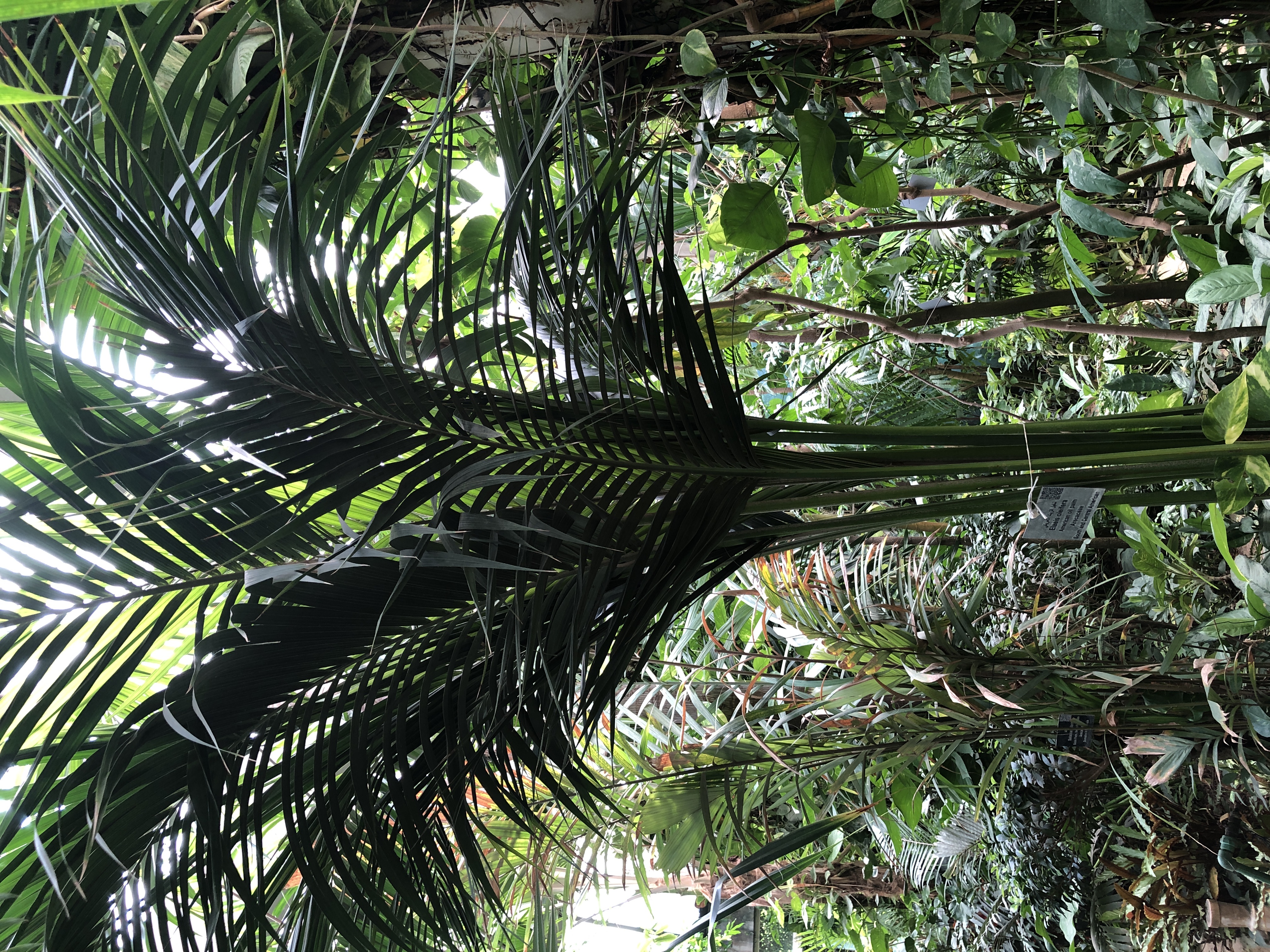 Evergreen palm grows to 4 - 6 m tall, 40 cm in diameter leaves large, arching, pinnate It has dense clusters of crowded flowers , The plant produces both male and female flowers, but not usually at the same time An individual inflorescence will be all male or all female flowers after a series of inflorescences of one sex the plant will then produce a series of inflorescences of the opposite sex Fruit red