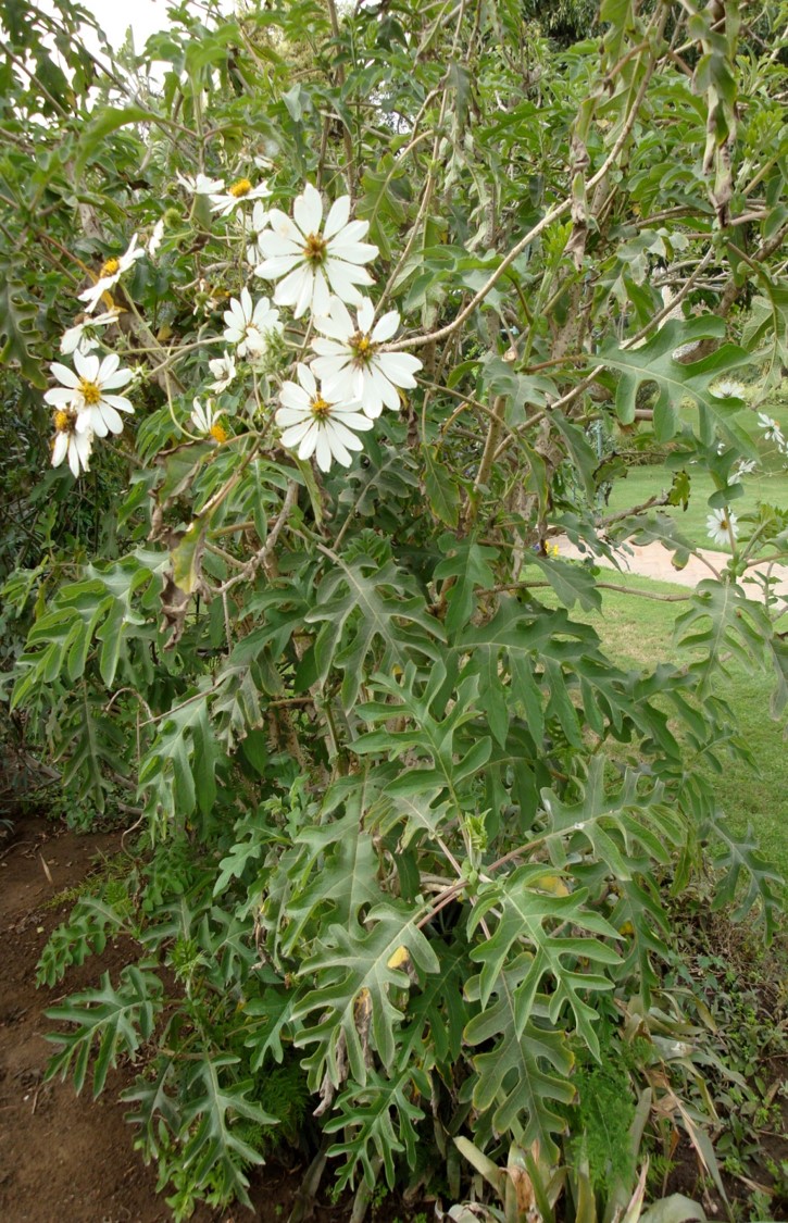 Evergreen shrub to 3-4 m leaves pinnatifid, green above, paler below, softly hairy on both surfaces flowers ray petals white, disc yellow center, many in terminal, branched inflorescences fruit reddish-brown one seeded, 35 mm long, papery