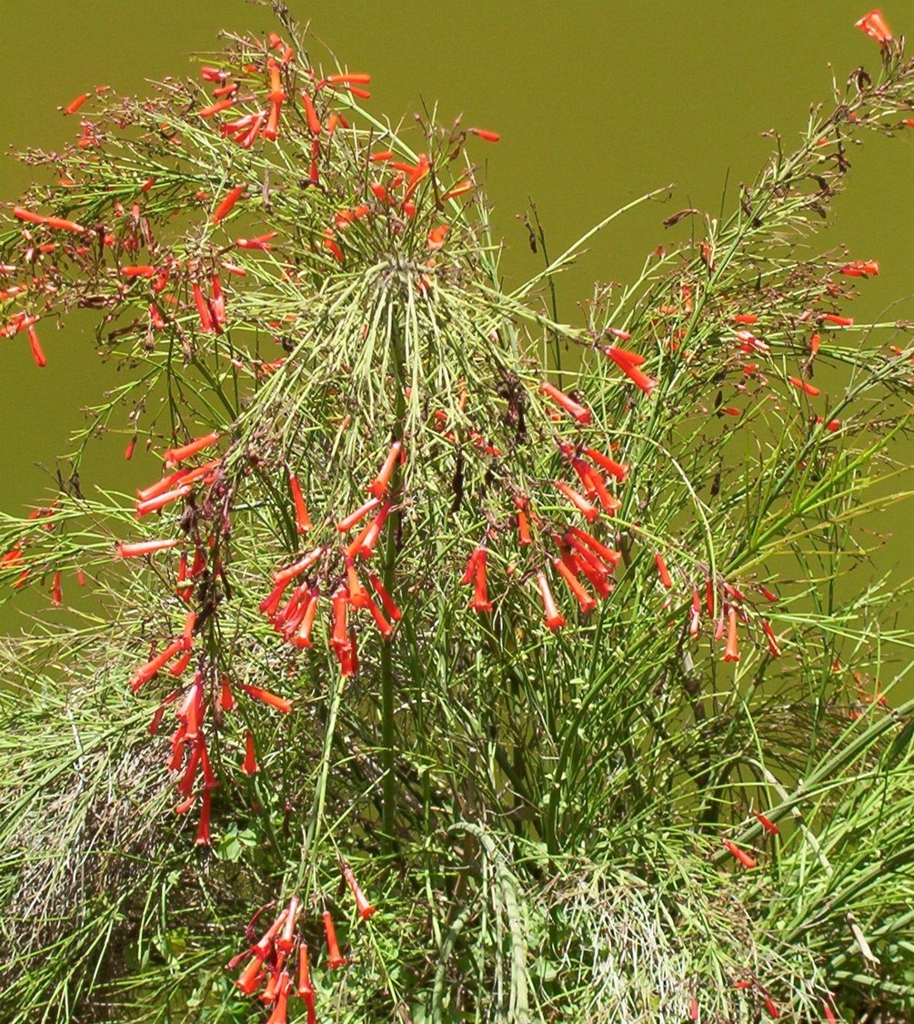 Multi-branched subshrub, able to grow up to about 1 - 15 m tall and with a spread of 2 - 4 m wide leaves are reduced to small scale-like leaflets, bright green, ovate to elliptic, measuring about 85 - 15 mm long by 6 - 9 mm wide flowers Slender, bright red, tubular flowers measuring about 25 cm long, borne on the tip of branches resembling firecrackers, usually in 1 - 3 flowered clusters Fruit is dry, brown capsule, oval or globose in shape and measuring about 3 - 6 mm wide