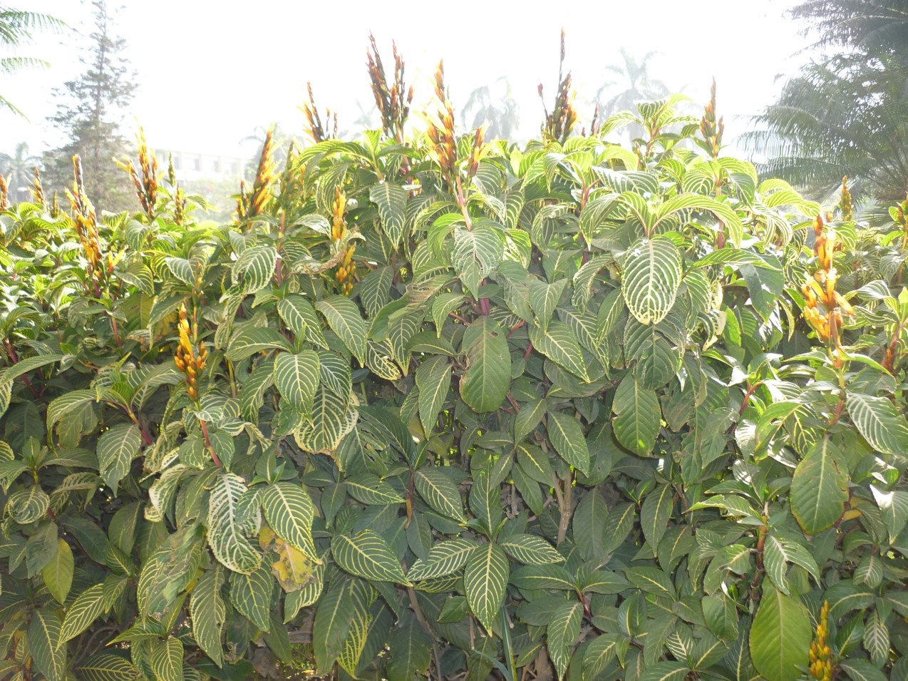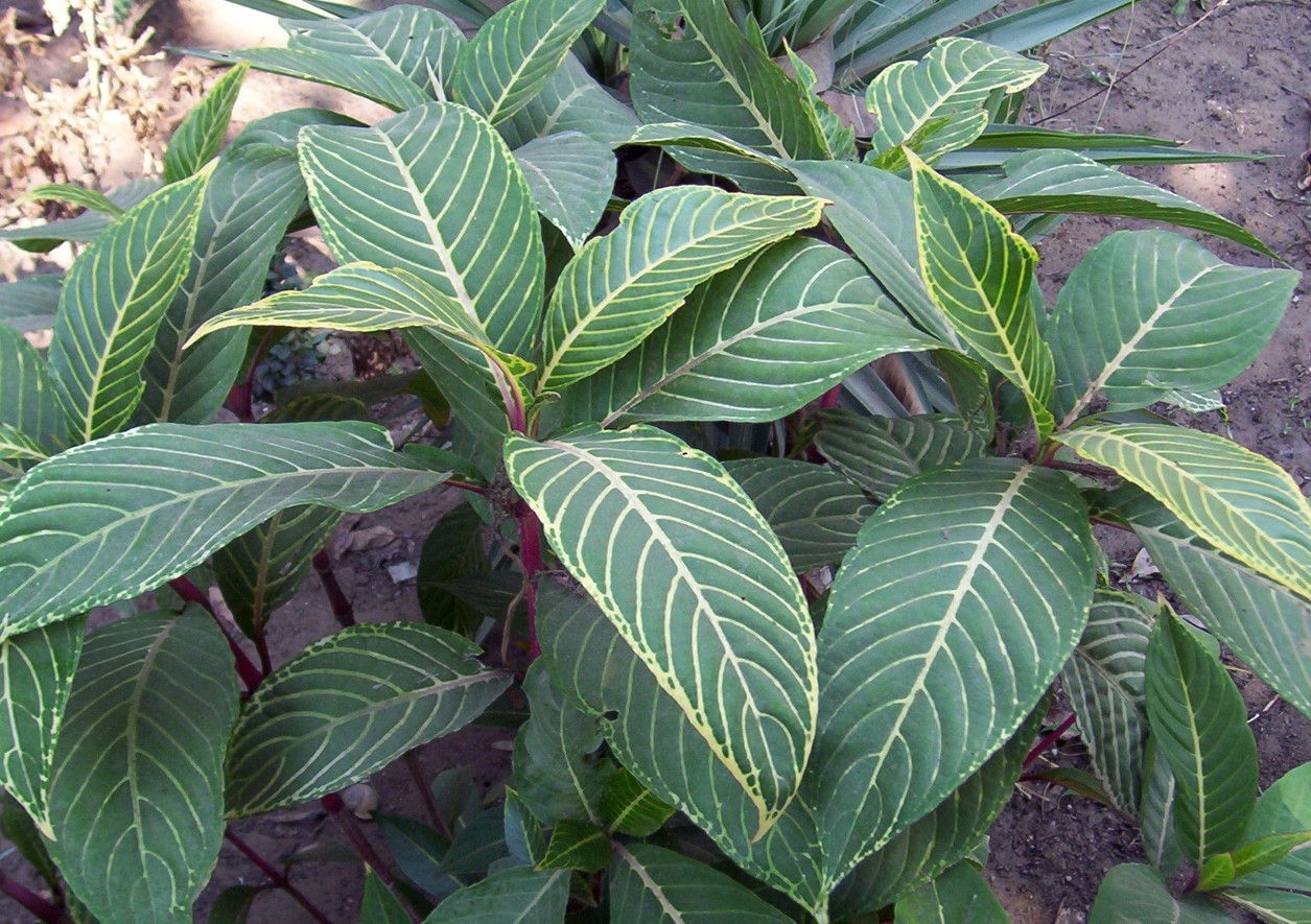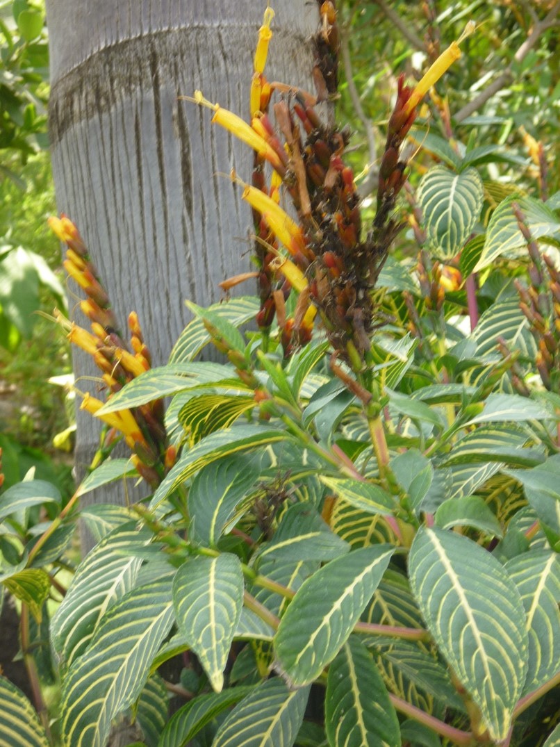 Evergreen large shrub usually up to 2 -3 m tall leaves have prominent yellow or cream-coloured veins flowers  in spikes, tubular, 5 cm long surrounded by red or orange bracts