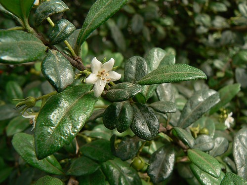 Evergreen shrub growing to 4 m tall, leaves 10-50 mm long and 5-30 mm wide flowers white, small fruit drupes 4-6 mm in diameter, ripening brownish orange