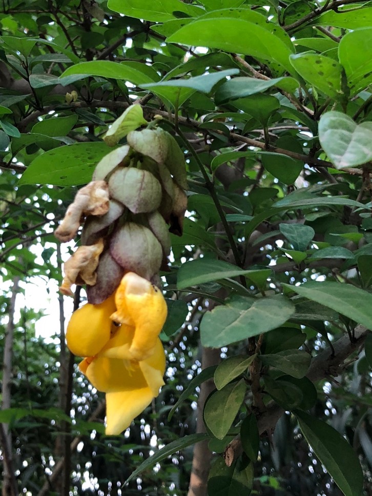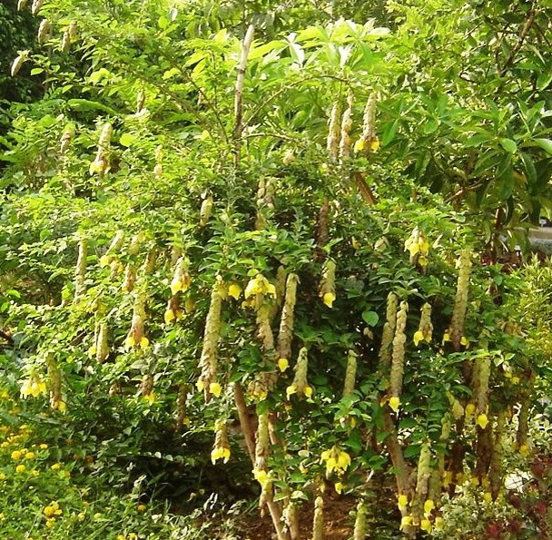Climbing shrub, leaves leathery blades that are egg- shaped to elliptic to drop-shaped flowers yellow, 5-8 cm long, and arranged in hanging cones with pointed red bracts fruit  drupe 3 cm long