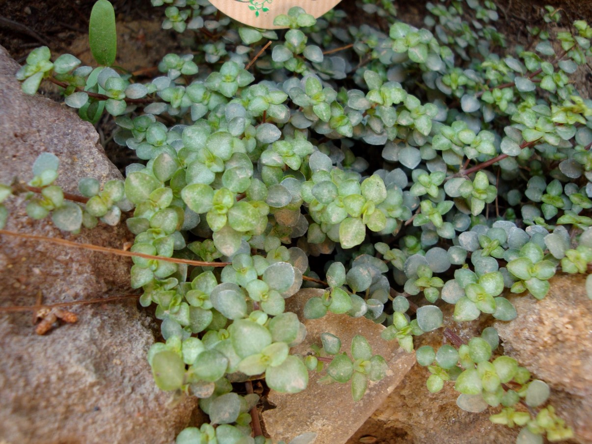 small herbaceous shrub with a trailing growth habit reddish stems leaves small, tiny, gray flowers small pale pink above the foliage