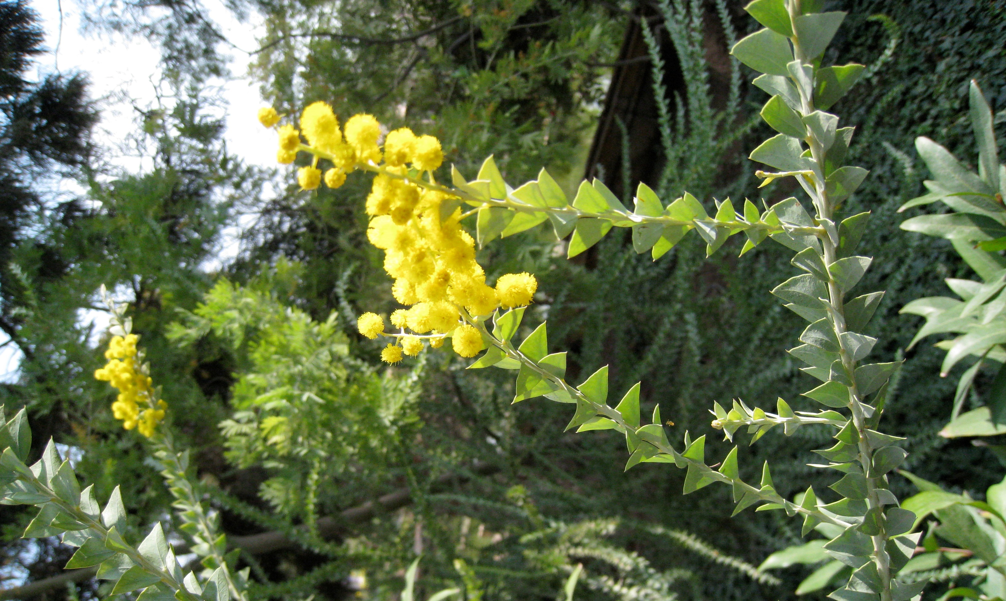 Evergreen shrub, spreading habit , grows to 2- 4 m high leaves phyllodes, crowded along the stems, green-grey, asymmetrical, shaped is triangular flowers showy, fragrant, yellow in axillary 1-8 cm long racemes