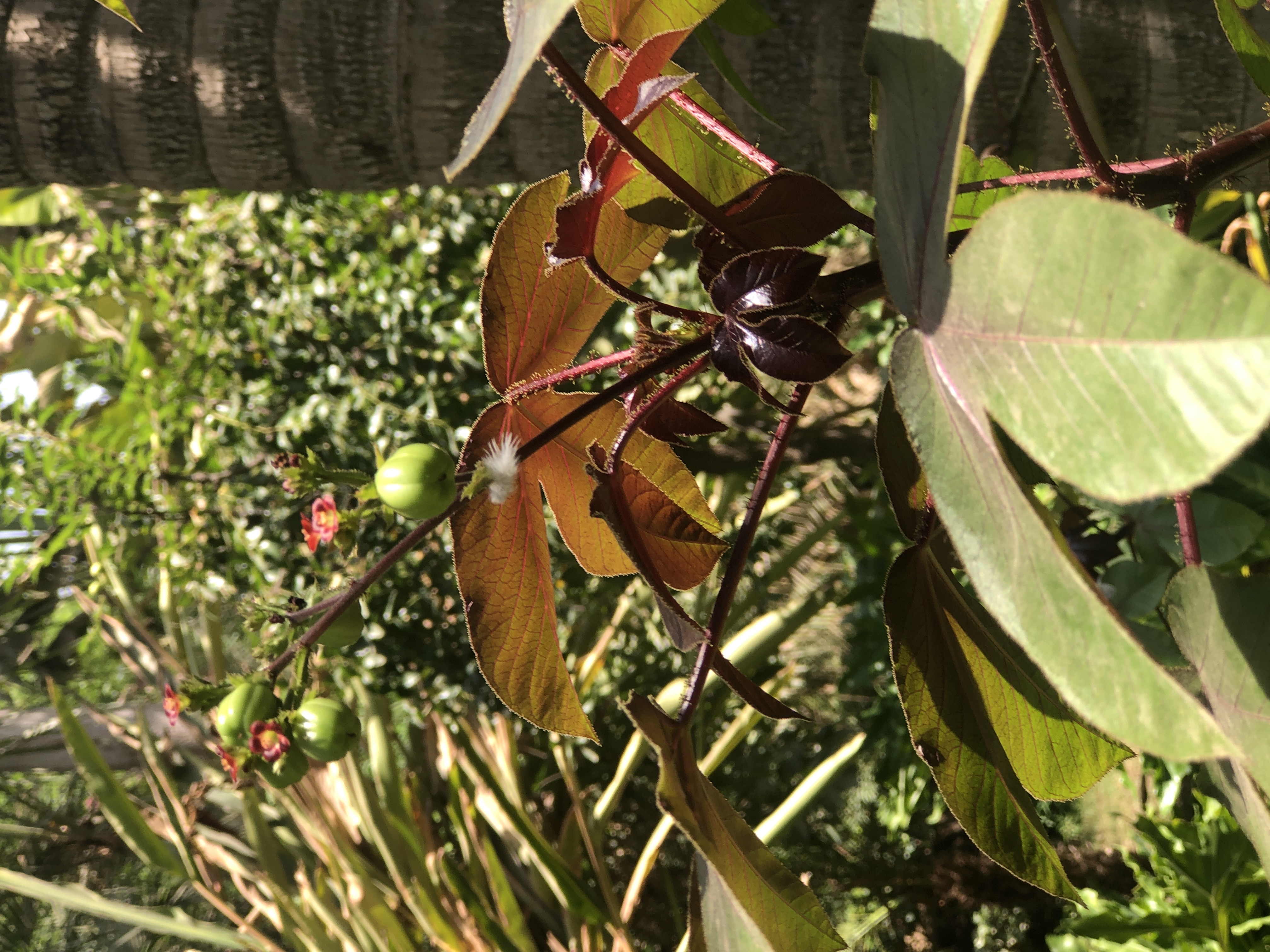 Sub shrub grows to 15-4 m high leaves 3-5 lobes, purple when young, bright green with age, 4-10 cm long and 5-13 cm wide flower small red with yellow centre fruit capsule, 3 lobed, 15 cm long, seeds oblong