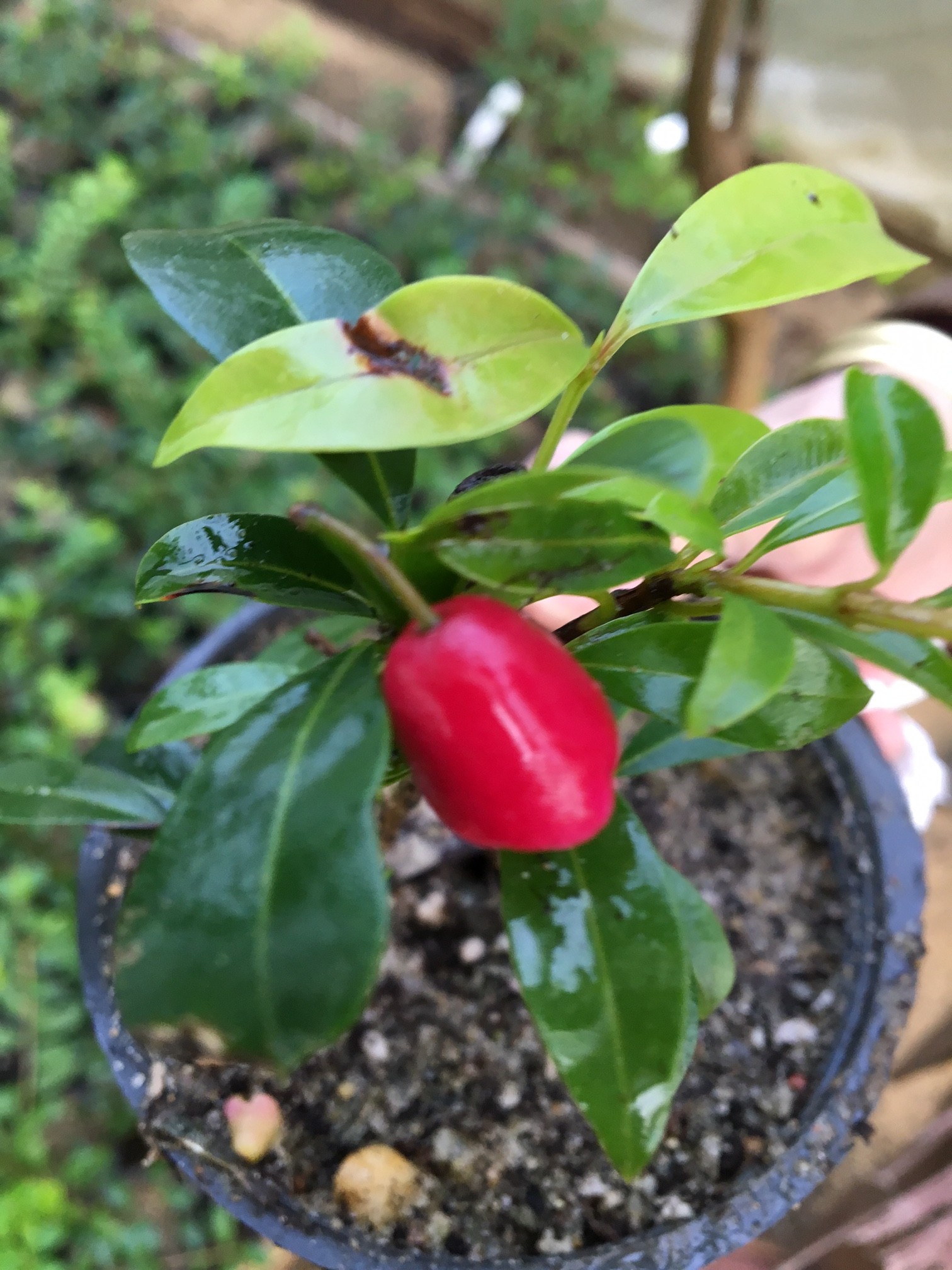 Evergreen shrub, grows 18-5 m leaves 5-10 cm long, 20-37 cm wide flowers creamy-white, very small, held in clusters in leaf axils fruits ripen from green to scarlet, oval, 9 mm long, seed single embedded in edible, sweetish white pulp