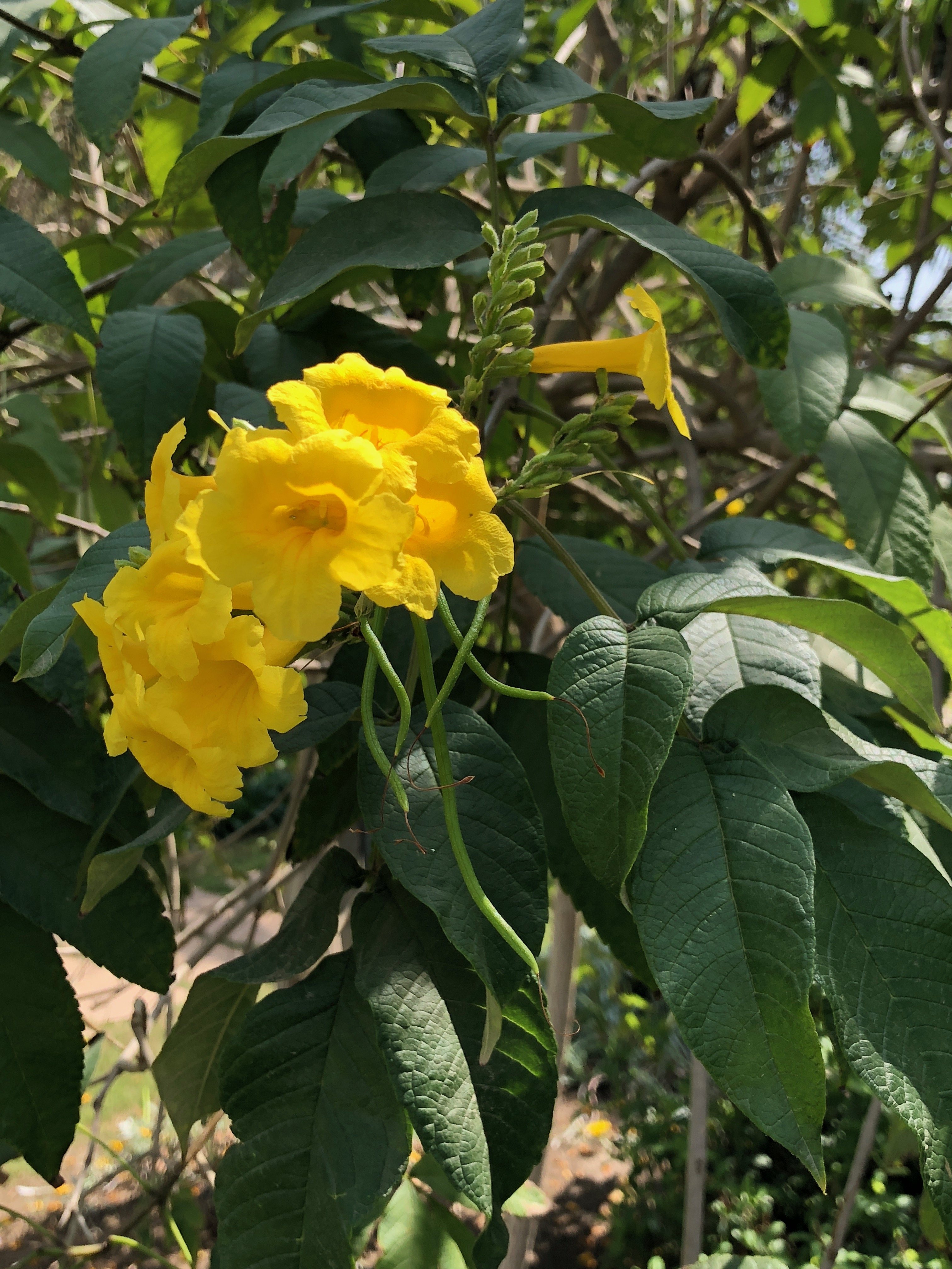 Evergreen shrub grow up to 3-6 m tall leaves compound, serrated margins flowers scanted, yellow bell-shaped, appear at the end of branches which spread outwards, The flower buds pop when squeezed fruit elongated, capsule 10-30 cm long, 5-20 mm wide, seeds numerous papery