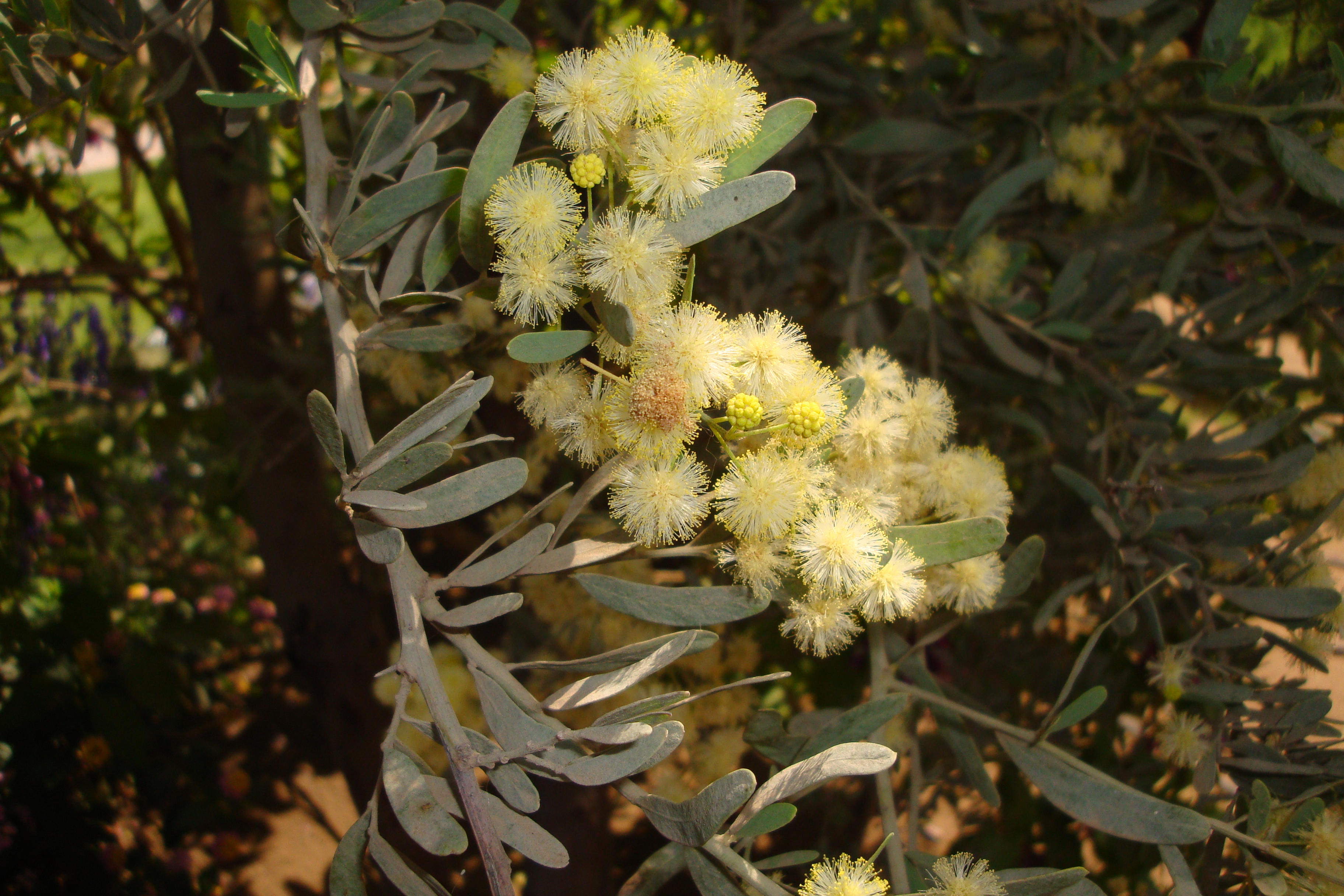 Shrub-like tree with with multiple trunks grow 5-6 m leaves phyllodes, flowers clustered with yellowish and strongly scented fruit legume 8 cm pale coloured