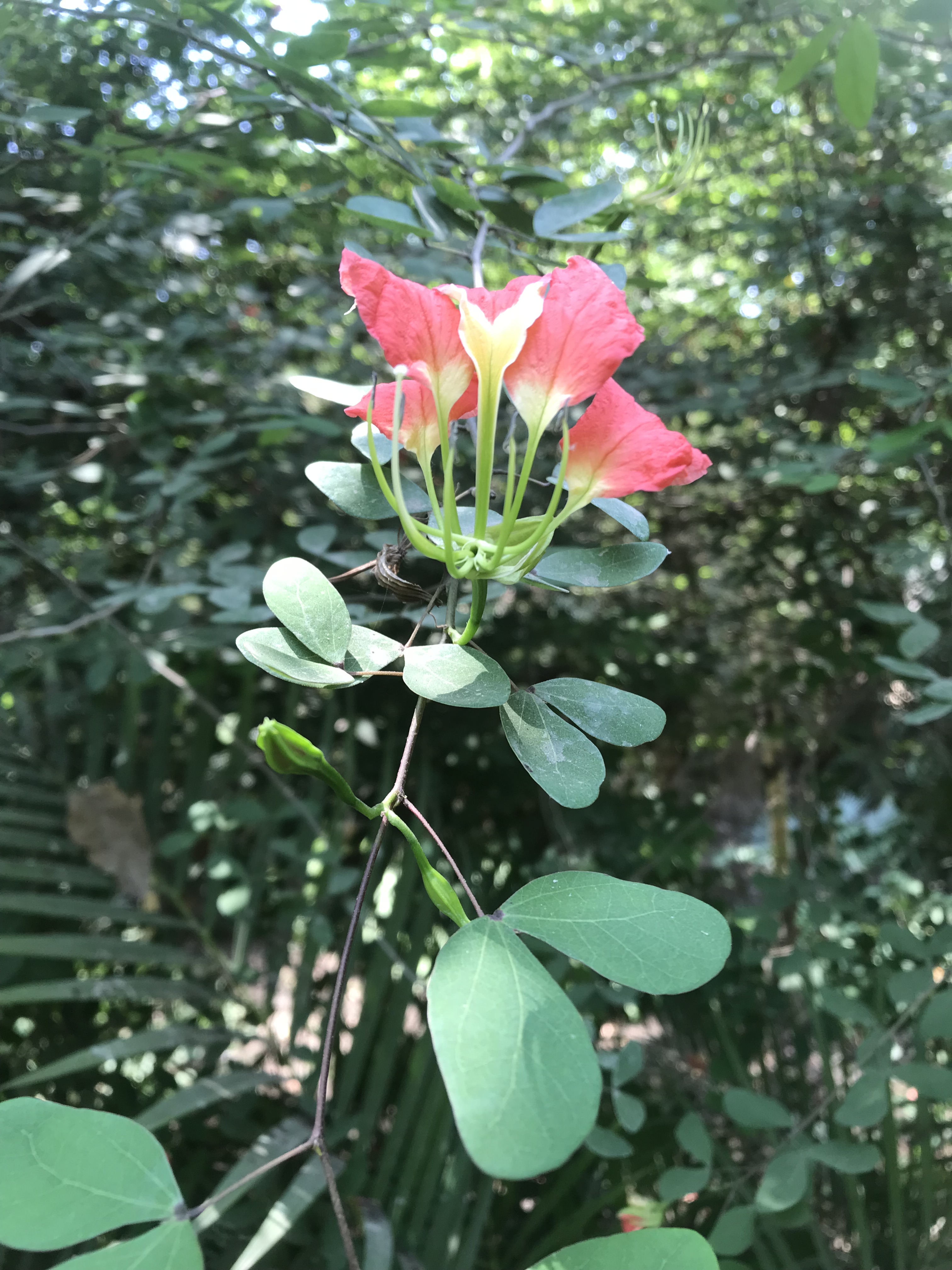Deciduous shrub or small tree grows to 2-3 m tall, leaves bilobed, orchid-like flowers bright red with a green and yellow center fruit flat, elliptic, oblong, obovoid, woody or thinly valve