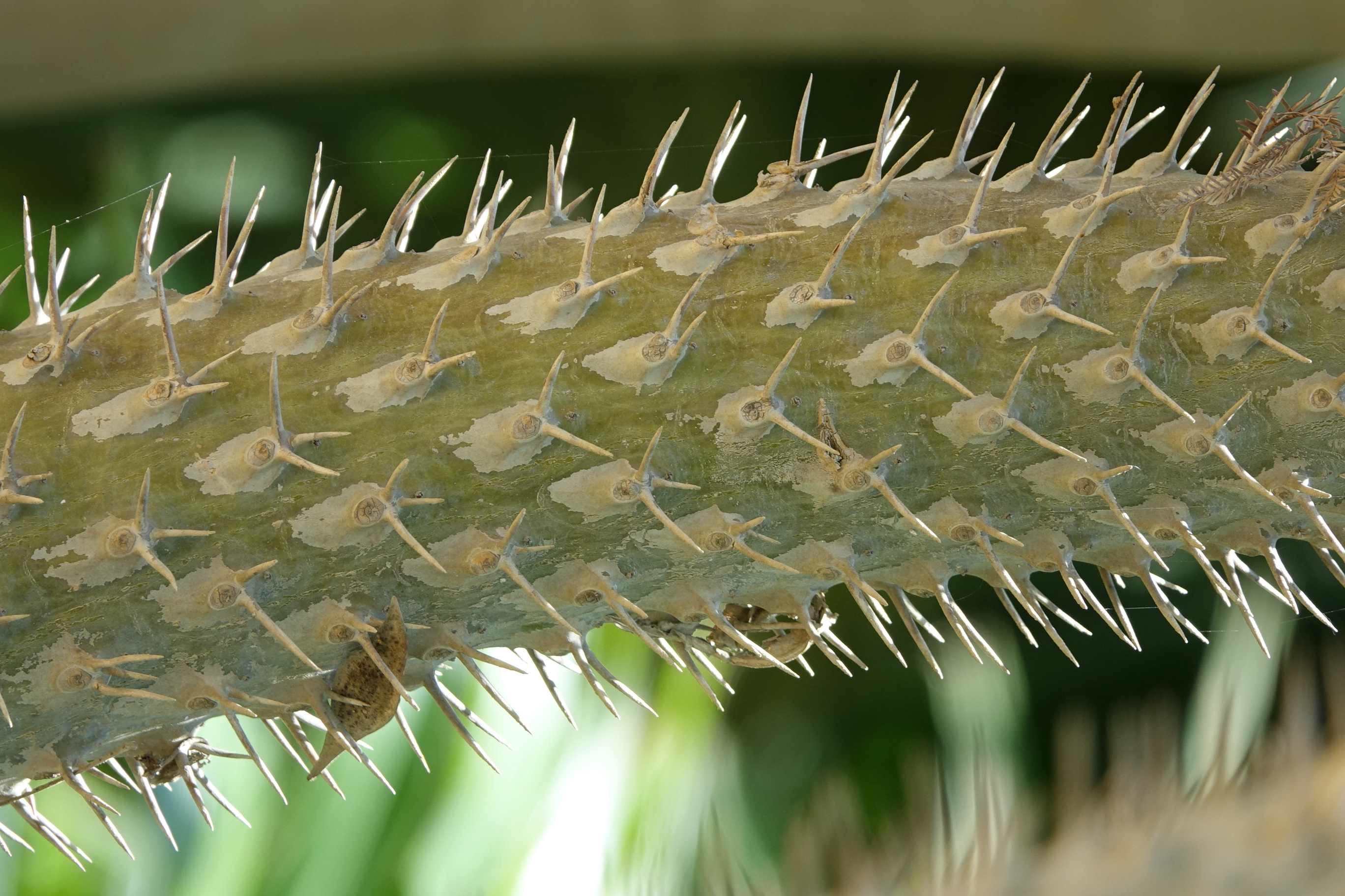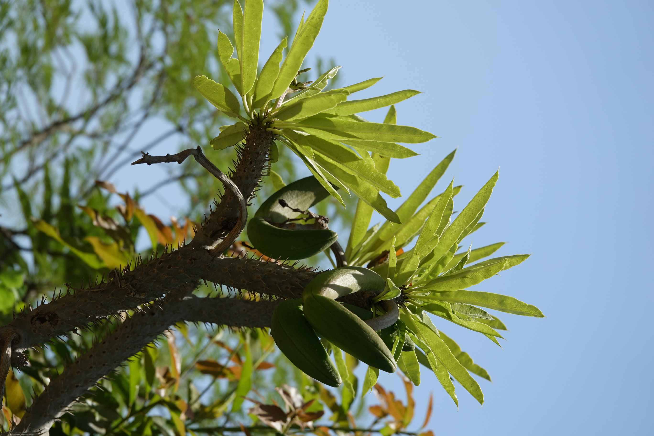 Semi deciduous or deciduous, succulent stemmed tree, 3-6 m tall stem spiny, trunk 30 cm in diameter leaves simple, green, lanceolate, arranged spirally mostly just at the top of the plant Petiole up to 4 cm long flowers salverform, white with yellow centre fruit pods 15-20 cm long