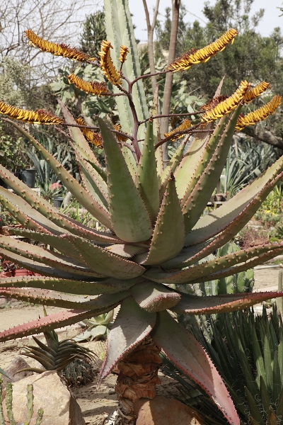 Arborescent aloe, large robust head of stiff leaves stiff, gray-green up to 15 m long, covered in short spines on the convex lower surfaces and concave upper surfaces the inflorescence is a much-branched, flowers yellow through orange to bright red