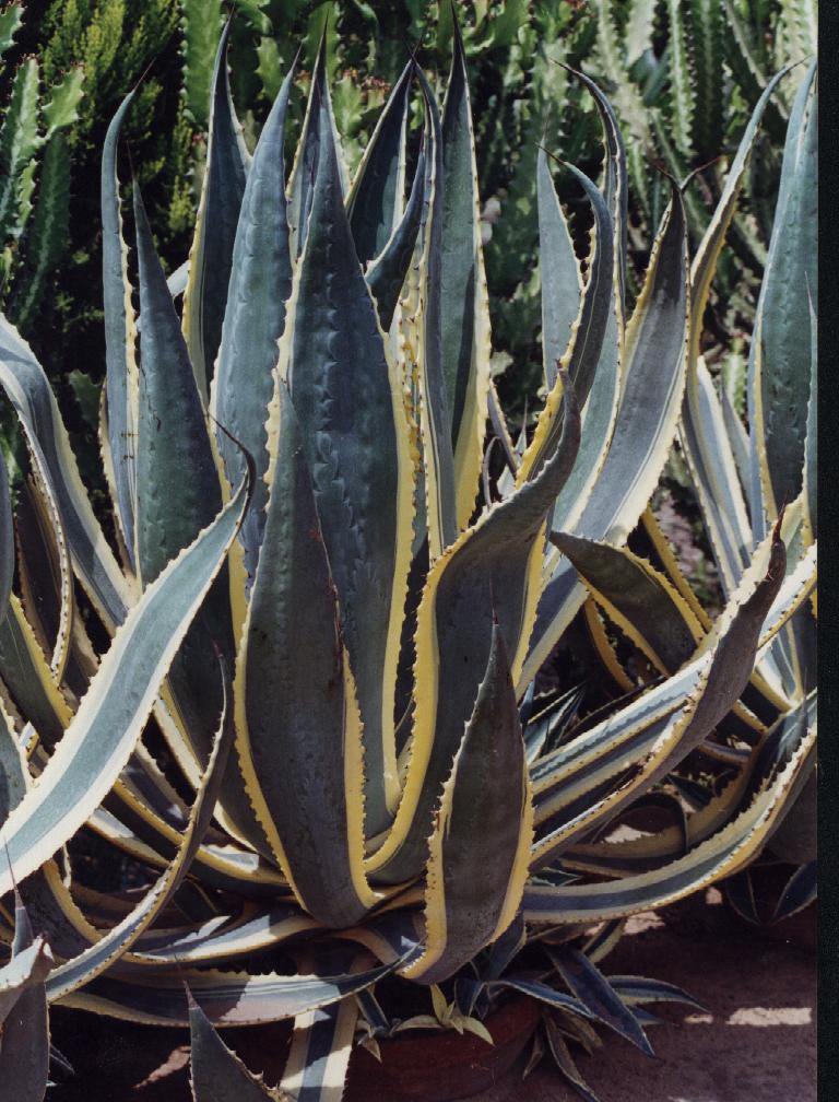 Is a Large, sculptural succulent with rosettes of thick, leaves gray green, pointed that end in sharp spines flower spike that appears late in the plant's life