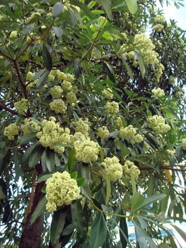 Evergreen tree , grow up to 40 m tall, 30 - 50 cm in diameter leaves glossy, leathery, obovate to elliptical the inflorescences is a much-branched terminal panicle, flowers white, cream or green fruit a pendulous, two-lobed, spindle-shaped containing numerous flat, oblong seeds, with a tuft of hairs