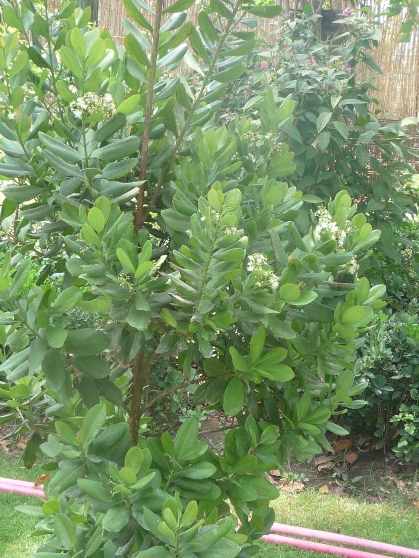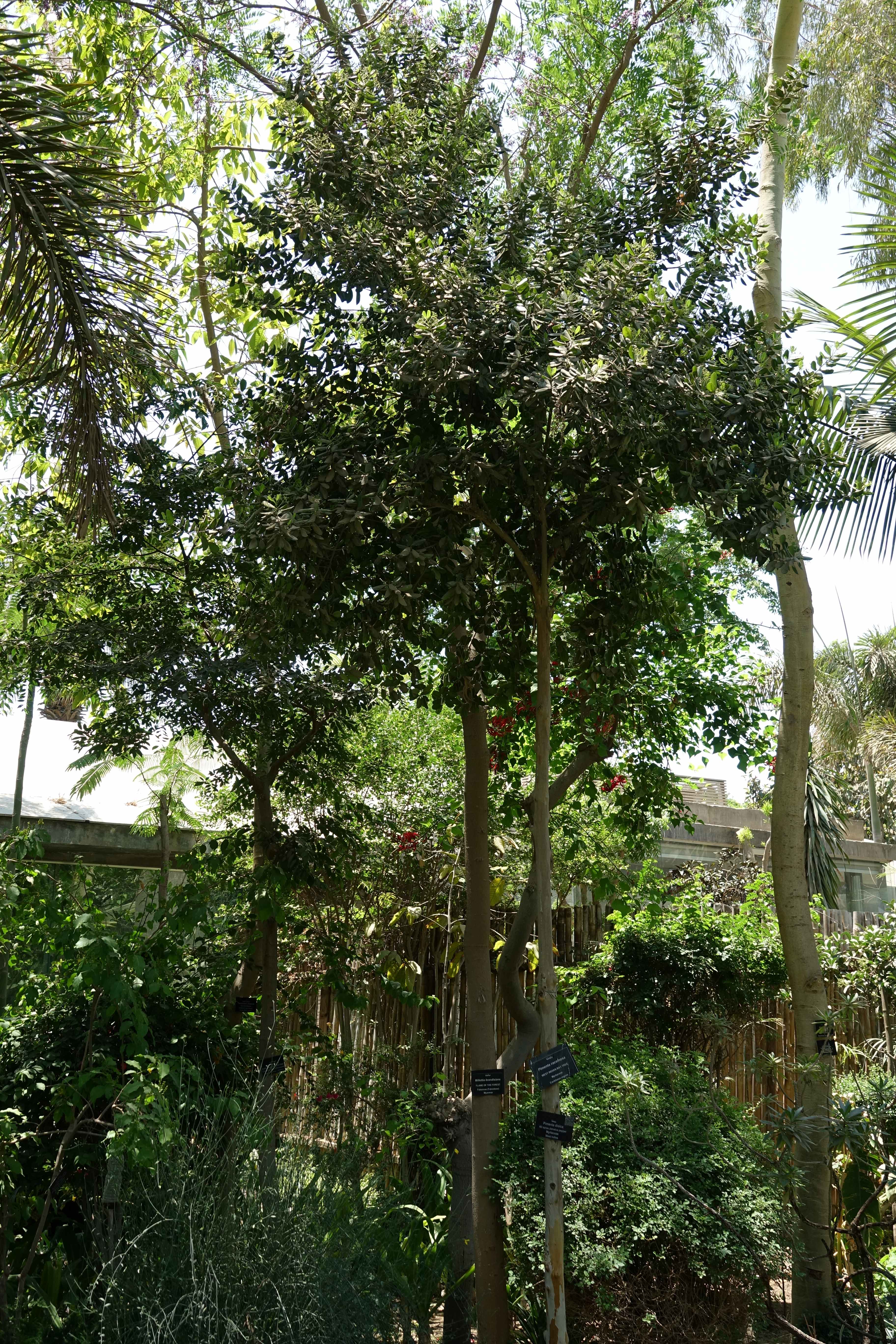 Evergreen tree to 15 m tall leaves elliptic, leathery, in opposite arrangement and dotted with glands which gives off aromatic smell when crushed inflorescence 5-15 cm long and panicle, flowers white, fragrant fruit sub globose, berry, green unripe, purple black on ripening