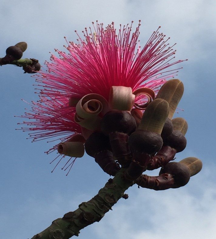 Deciduous small tree to 10 - 18 m high  succulent stems  leaves palmate, rich green 3-6 leaflets flowers solitary or paired, pink, coiled petals, stamens many united at base, silky rose pink, tipped with golden anthers fruit a capsule, to 15 cm yellow-brown, dehiscent, seeds embedded in silky fiber