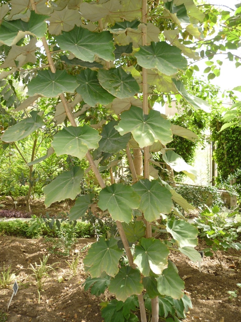 Evergreen tree to 30 m high leaves leathery ovate to orbicular on outline to 30 cm across, peltate or cordate at base, flowers axillary, solitary, sepals rusty-tomentose, slightly longer than the white petals fruit a woody, 5- celled capsule to 15 cm long, seeds many, flattened, winged apically