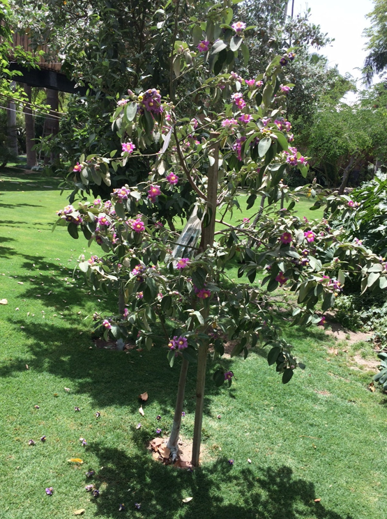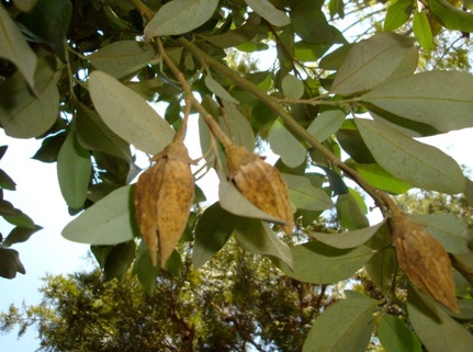 Fast-growing evergreen tree to 10-20 m tall leaves leathery , olive green, oval, gray-  green beneath flowers like hibiscus, pink fading to white with petals encircling fruit pendant  fuzzy brown capsules which release kidney-shaped seeds when ripe Seeds are enclosed by fine  hairs which can cause skin irritation to humans, hence the common name of cow itch tree
