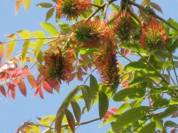 Deciduous tree to 30-60 m high, 90 cm in diameter leaves bipinnate about 30 cm compound leaflets and consisting of 5-6 elliptic-lanceolate leaflets and arranged in pairs, bright red when young flowers reddish green to orange fruit pod elongated and  flattened, seed slightly lens shaped, brown