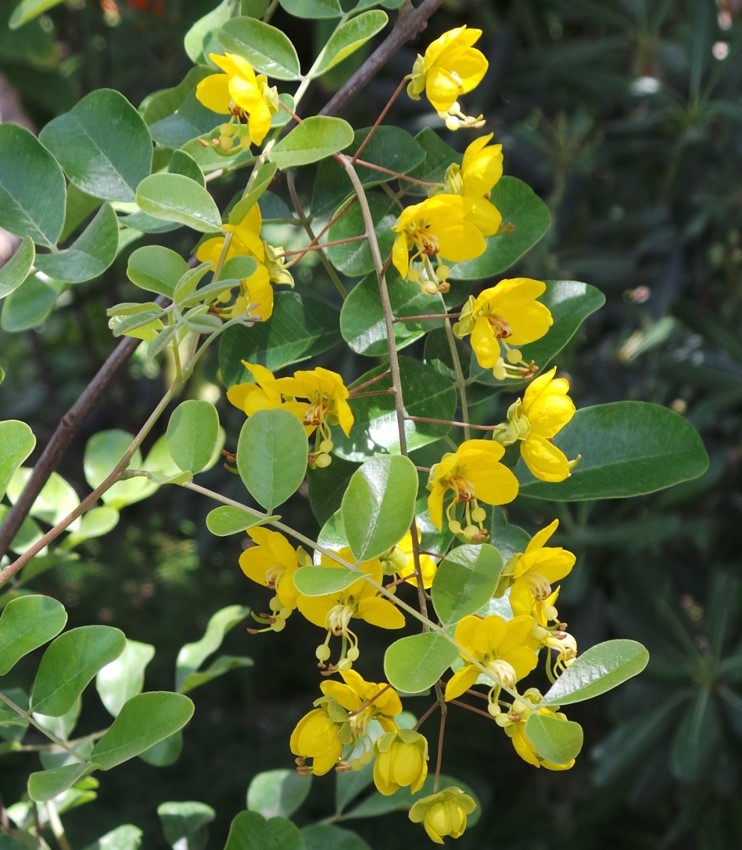 Shrub or small tree up to 12 m tall leaves compound, 2-6 pairs of leaflets, about 45 cm long flowers very decorative spikes of hanging yellow to red