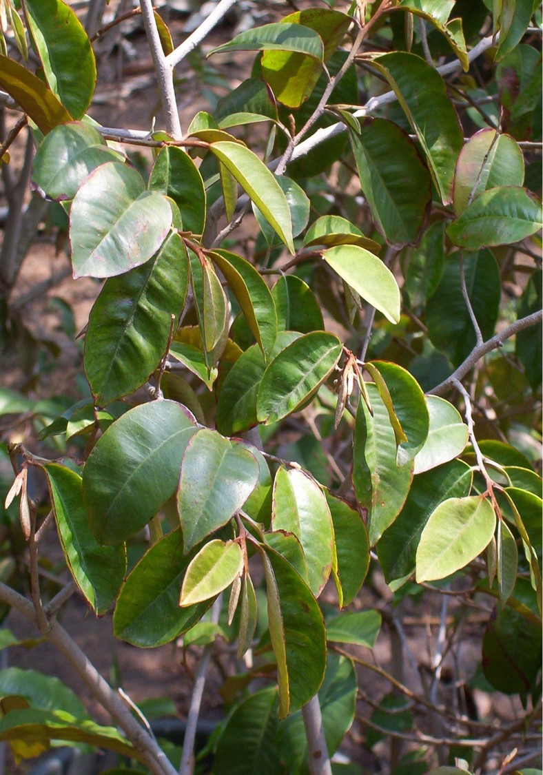 Evergreen shrub or small tree, 3-5 m high, 30 cm in diameter leaves alternate, ovate, 3-11 cm long flowers small creamy yellow fruit dark purple when ripe and have a gum-like skin that covers an inner whitish flesh They resemble an olive in size The fruits are edible, albeit very chewy They have several black seeds