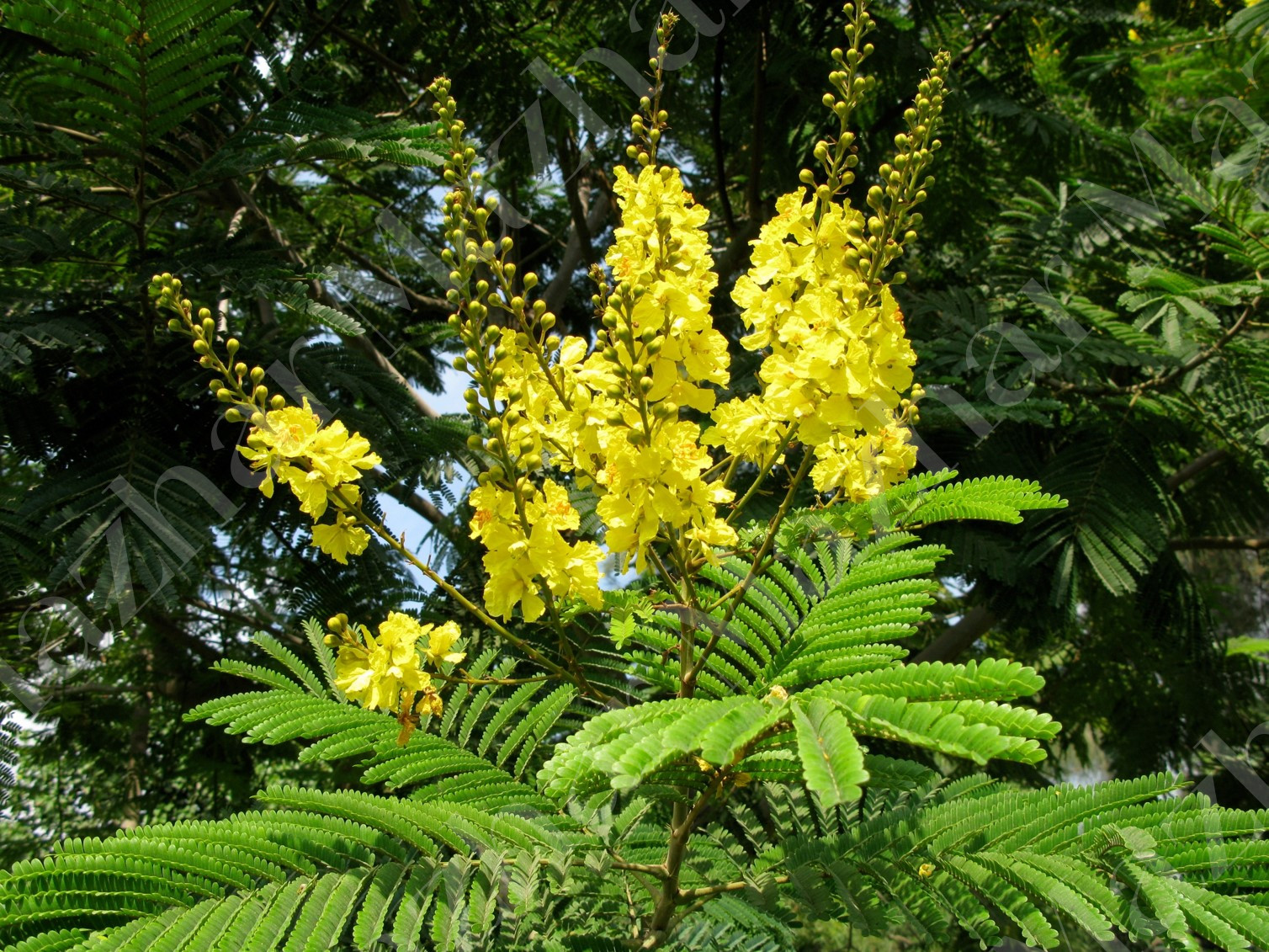 Deciduous tree to 15 m high, with a spreading crown leaves bipinnate with 4-7 pairs of pinnae, feathery leaflets flowers very showy, bright yellow fruit a flat pod, elliptic, tapering to apex and base, leathery, grayish-brown or yellow-tan and ripening to a dark brown, hanging in dense clusters, indehiscent